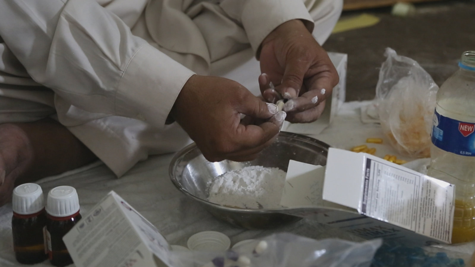 Gefälschte MedikamenteRAWALPINDI, PAKISTAN- Shehzad spends hours packing these pills. Although he is a free agent but he is on a basic wage, the man making the real money is the distributor he is packing for. Shehzad doesnt know if these pills will stay in Pakistan or be exported. (Photo Credit: National Geographic Channels/Rubia Dar)Bild: © National Geographic Channels