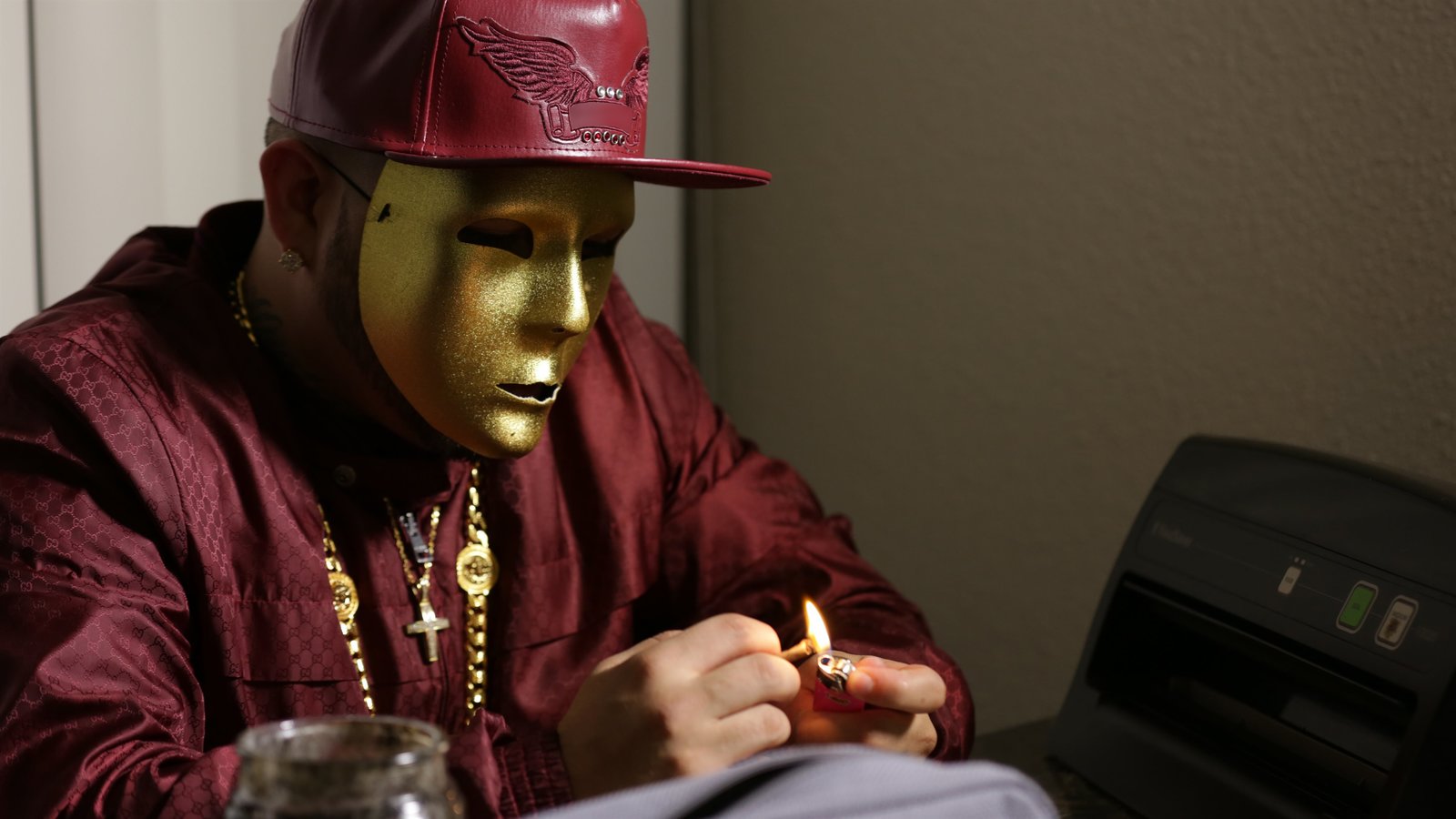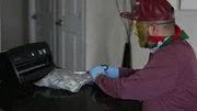 GeldwäscheHOUSTON, TEXAS- 'Veestar' in a mask near a money counting machine.Bild: © National Geographic Channels