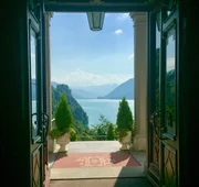 Schlösser der Belle ÉpoqueVor dem Hoteleingang eröffnet sich der Panoramablick auf den Brienzer SeeBild: © ZDF und SRF