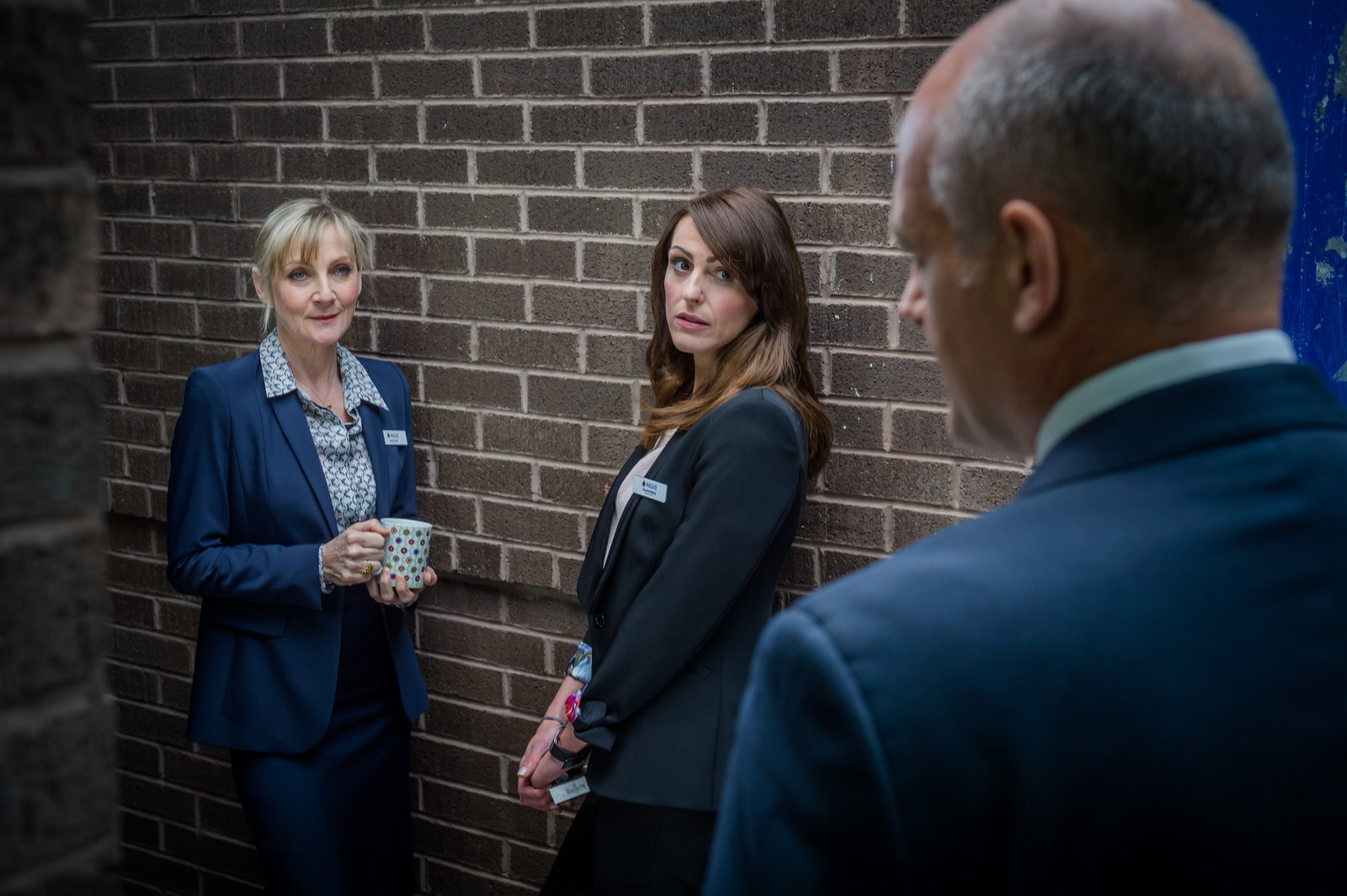Falsche NummerDC Ian Mitchell (David Prosho, r.) erwischt Janet Scott (Lesley Sharp, l.) und Rachel Bailey (Suranne Jones, M.) bei einem privaten Gespräch.Bild: © ZDF und Ben Blackall