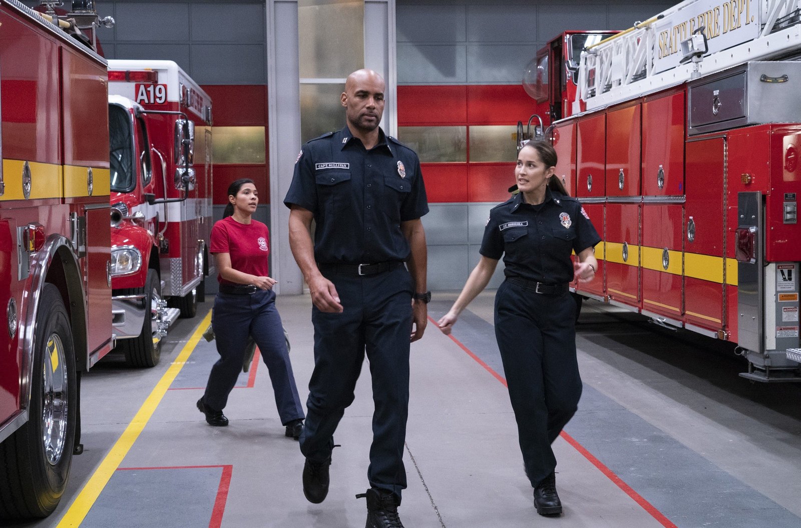 "Station 19", "Folge 23." Ein Blackout in Seattle führt zu vielen Notfällen. Nacheinander gehen die Notrufe ein, die Feuerwehrleute haben viel zu tun. Einerseits sollen sie in einem großen Wohnhaus ein abgängiges Mädchen finden. Andererseits müssen sie bei einem chronisch Kranken aushelfen, dessen medizinischen Geräte ausgefallen sind. Dieser möchte jedoch nicht ins Krankenhaus transportiert werden, sondern lieber zu Hause sterben.Im Bild (v.li.): Lisseth Chavez (Kathleen Noonan), Boris Kodjoe (Robert Sullivan), Jaina Lee Ortiz (Andy Herrera).Bild: © Byron Cohen / ABC / American Broadcasting Companies, / 2019 American Broadcasting Companies, Inc. All rights reserved.