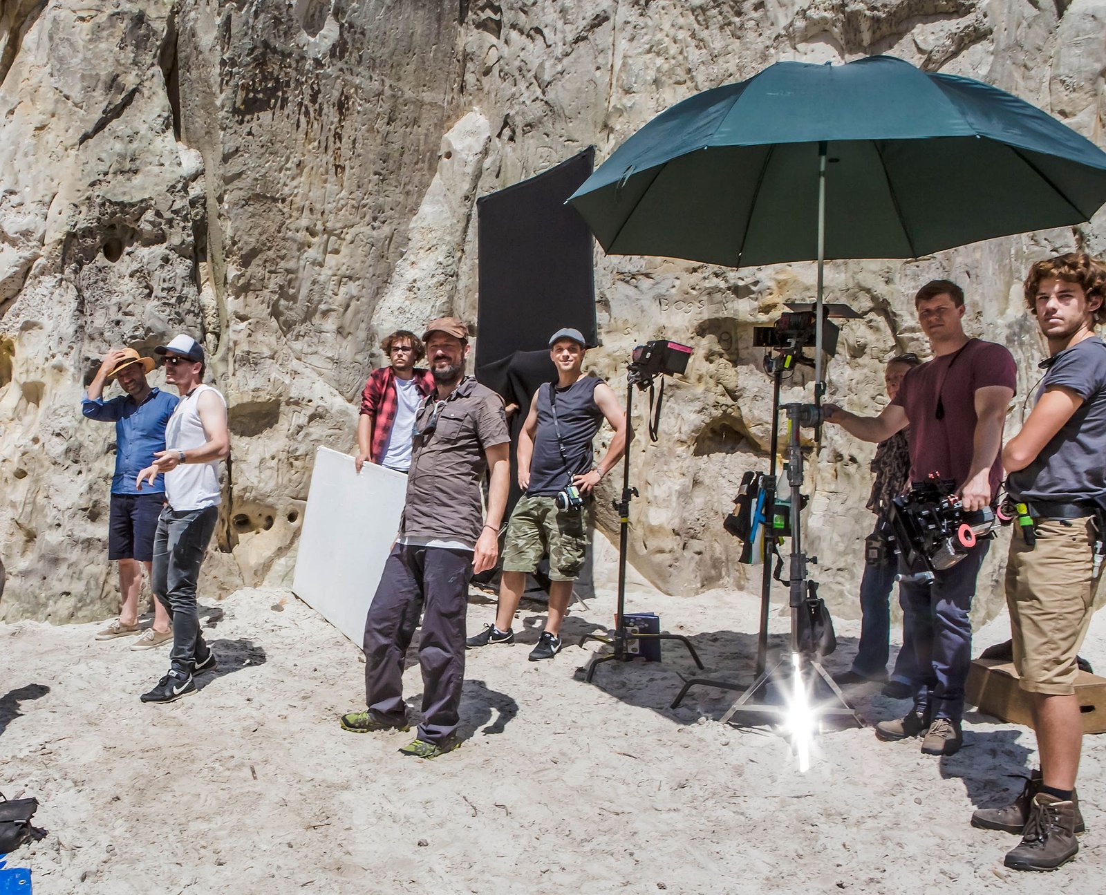 Das singende, klingende Bäumchen - Making-ofArbeitsfoto am Set im Harz (v.l.n.r.): Wolfgang Eißler, Regisseur, Michael Dudek, Regieassistent, Anthony Tenambergen, Beleuchter, Cornelius Plache, Kameramann, Patrick Goetz, Kameraassistent, Daniel Krause, Bühne, Mirko Hans, Kameraassistent.Bild: © rbb/Theo Lustig
