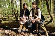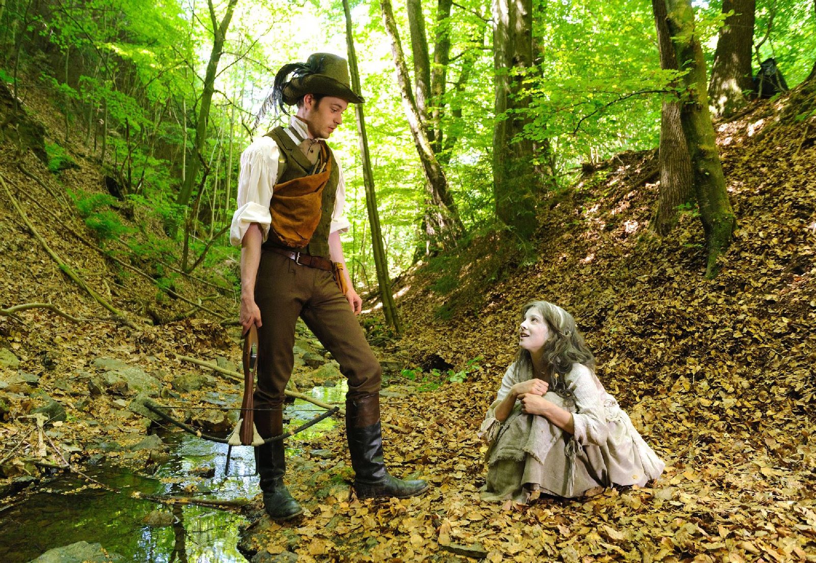 AschenputtelDer Prinz Viktor (Florian Bartholomäi) will wissen, was Aschenputtel (Aylin Tezel) im Wald verloren hat und ihn beim Schiessen stört.Bild: © ZDF und WDR/Hardy Spitz