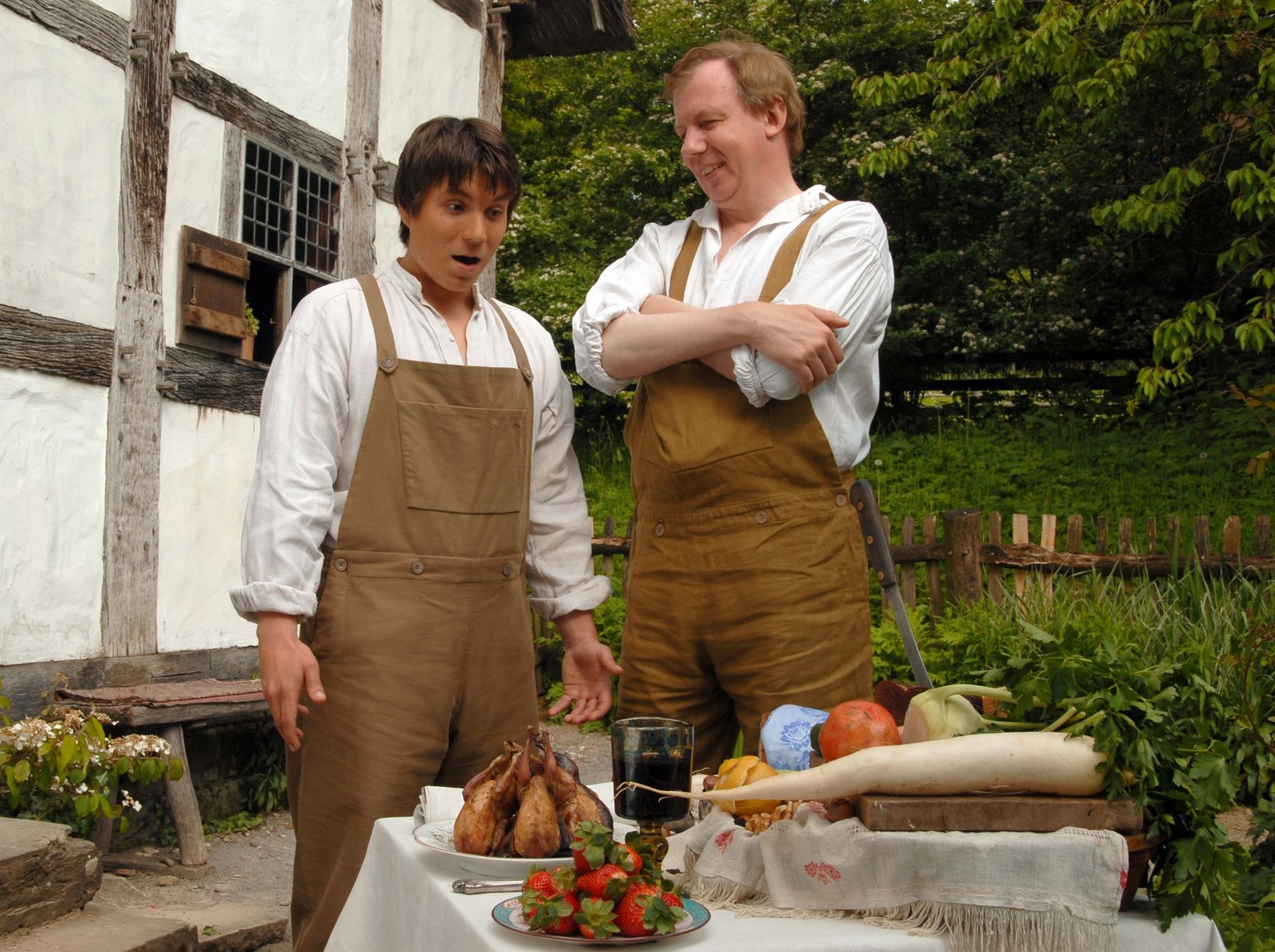 Tischlein deck dichDa staunt Jockel (Christian Polito, li.) nicht schlecht: Sein Meister, der Tischler (Ludger Pistor, re.) hat nicht gelogen. Der Tisch ist wie von Zauberhand reich gedeckt.Bild: © WDR/Hardy Spitz