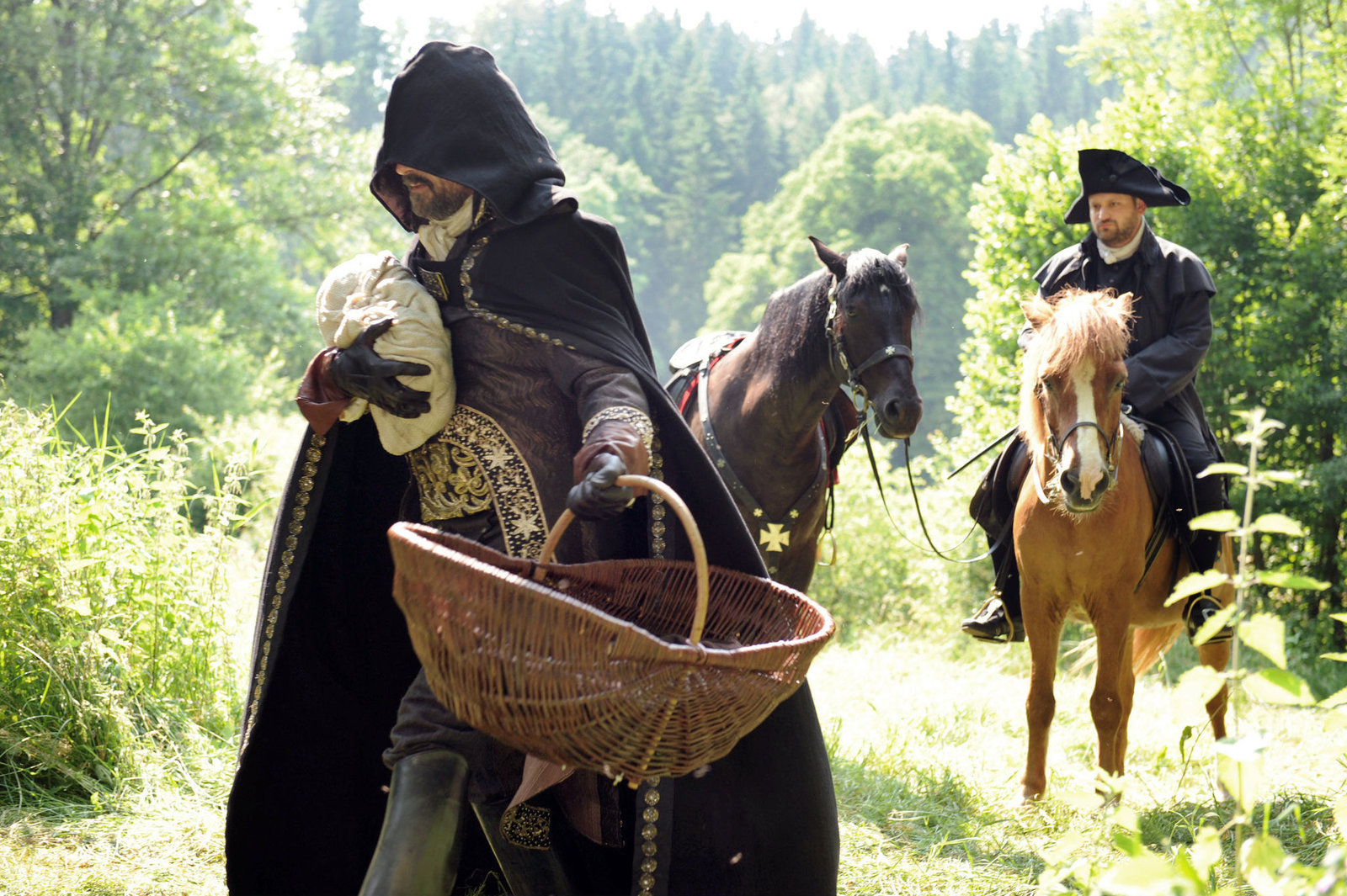 Der SchweinehirtDie Königin von Lichterwald (Margarita Broich) und ihr Sohn, Prinz Augustin aus dem Königreich Lichterwald (Emilio Sakraya), reiten zu ihrem Schloss. Nur eine reiche Hochzeit kann das verarmte Königreich retten.Bild: © ARD/rbb/Michael Rahn