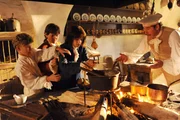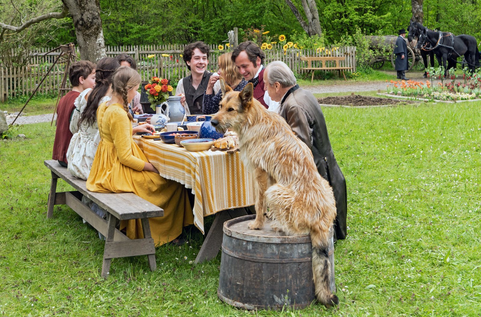 Die drei KönigskinderDie drei Königskinder erzählen im Garten der Pflegeeltern von den erlebten Abenteuern. v.l.n.r. Lotte (Hedda Erlebach), Königin Marie (Friederike Becht), Fritz (Caspar Kryzsch), Theo (Maximilian Ehrenreich), Emmi (Sonsee Neu), König Alexander (Florian Stetter) und Corbinian (Rüdiger Vogler) und einer von Alexanders Hunden im Garten der GärtnersfamilieBild: © SWR/Patricia Neligan