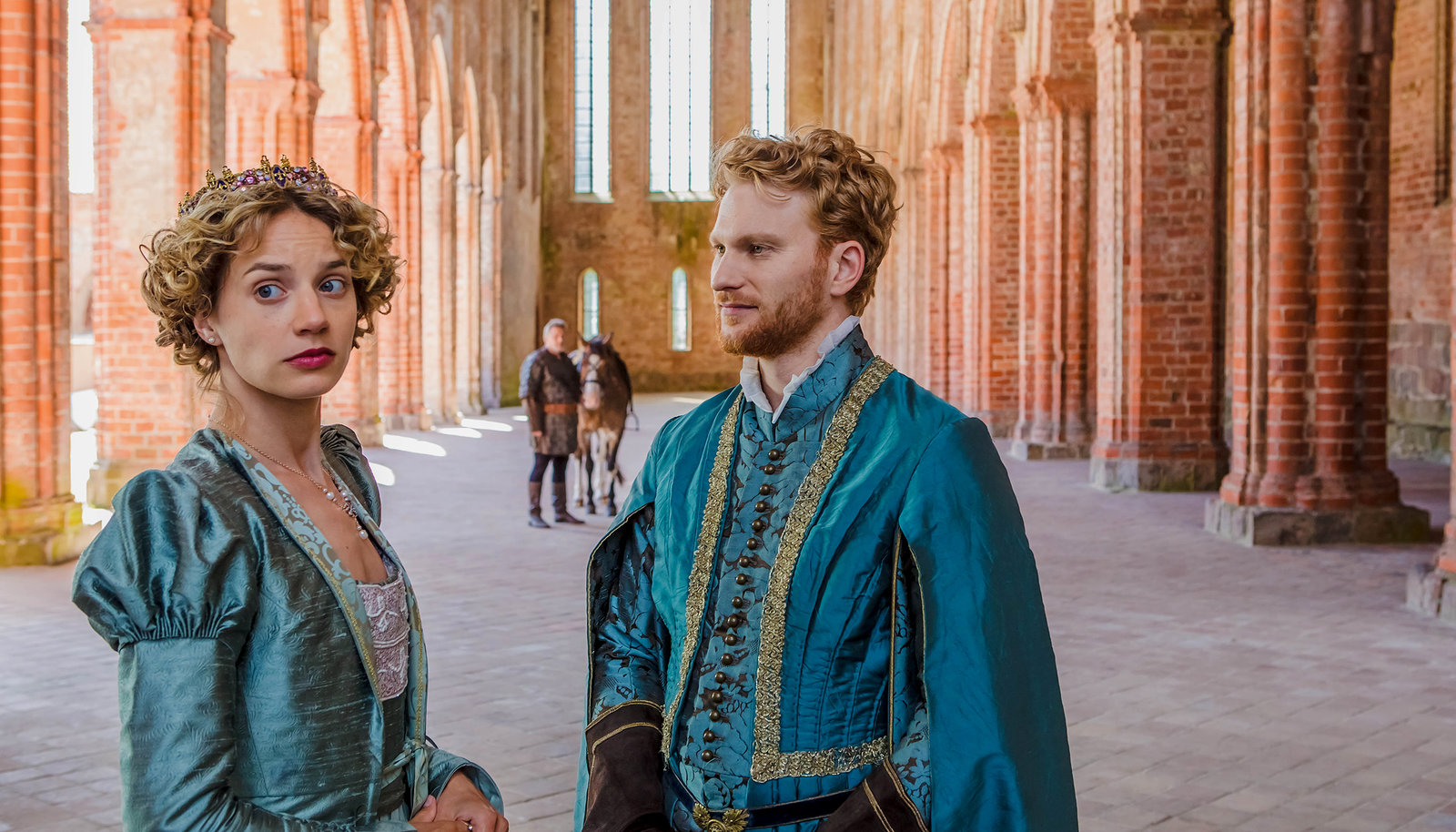 Das singende, klingende BäumchenDer Prinz (Lucas Prisor) und die Prinzessin (Jytte-Merle Böhrnsen) bei ihrer ersten Begegnung. (Drehort: Kloster Chorin)Bild: © rbb/Theo Lustig