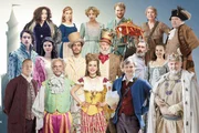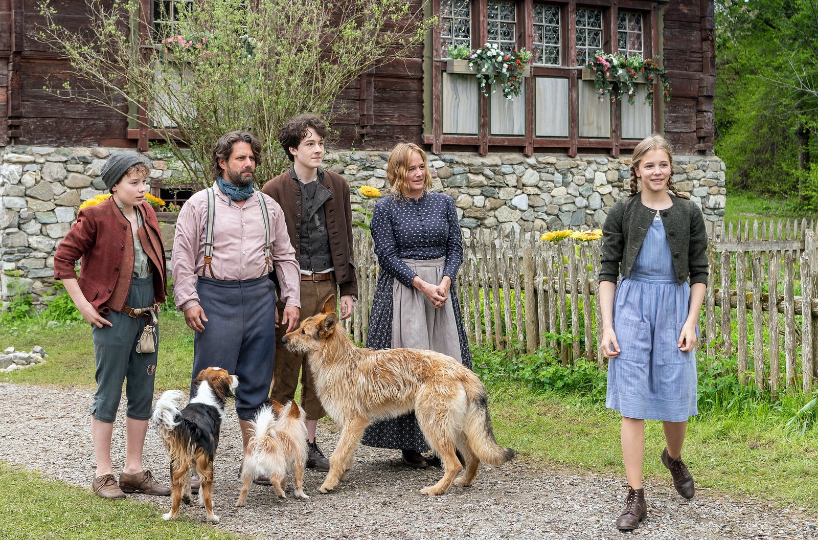 Die drei KönigskinderBei der Geburt wurden die drei Königskinder durch Hunde ersetzt – hier treffen sie zusammen mit ihren „Hundegeschwistern“ auf die Pflegeeltern Emmi (Sonsee Neu) und Hans (Adam Bousdoukos). v.l.n.r. Fritz (Caspar Kryzsch), Hans (Adam Bousdoukos), Theo (Maximilian Ehrenreich), Emmi (Sonsee Neu) und Lotte (Hedda Erlebach) mit den drei Hunden von König AlexanderBild: © SWR/Patricia Neligan