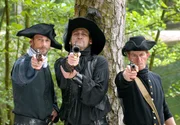 Tischlein deck dichIm Wald, da sind die Räuber: Der Räuberhauptmann (Ingo Naujoks, M) lauert mit seiner finsteren Bande (Lars Weström, li. und Michael Bittinger, re.) arglosen Wanderleuten auf.Bild: © WDR/Hardy Spitz