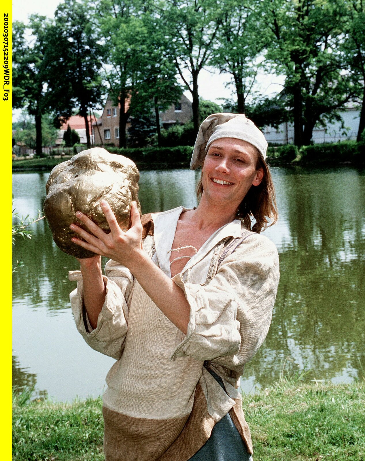 Hans im GlückDer Lohn für sieben Jahre: Mit einem dicken Klumpen Gold tritt Hans im Glück (Andreas Bieber) seine Heimreise an.Bild: © WDR