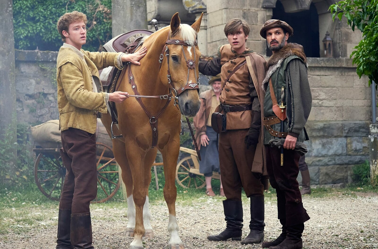 Das Wasser des LebensARD/WDR DAS WASSER DES LEBENS, "Sechs auf einen Streich", Regie Alexander Wiedl, Buch David Ungereit, am Montag (25.12.17) um 14:45 Uhr im ERSTEN. Prinz Lennard (Gustav Schmidt, M), Jäger Baldur (Luca Zamperoni, r) und der Stallbursche Gunther (Marcel Gewehr, l) schauen Prinz Falk hinterher, der sich aufmacht das Wasser des Lebens zu finden. © WDR/Kai Schulz, honorarfrei - Verwendung gemäß der AGB im engen inhaltlichen, redaktionellen Zusammenhang mit genannter WDR-Sendung bei Nennung "Bild: WDR/Kai Schulz" (S2+). WDR Presse und Information/Redaktion Bild, Köln, Tel: 0221/220 -7132 oder -7133, Fax: -777132, bildredaktion@wdr.deBild: © WDR/Kai Schulz