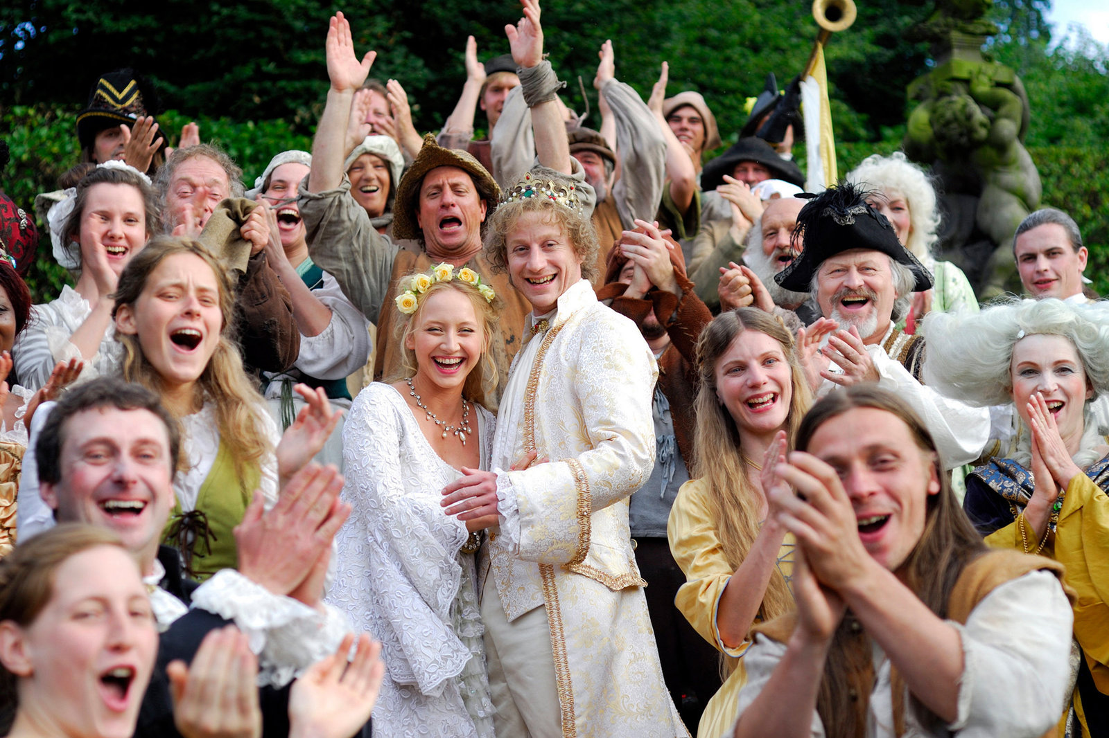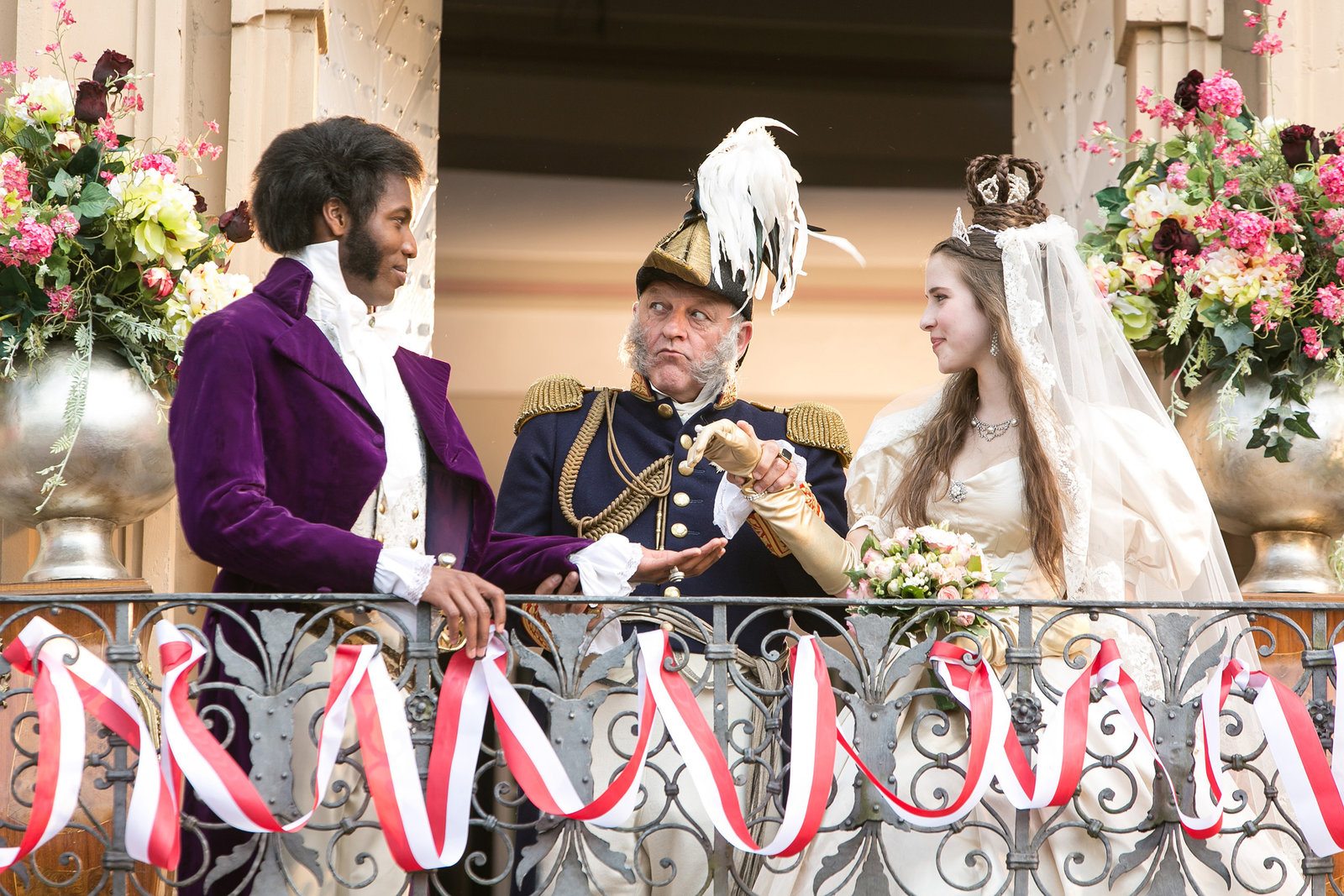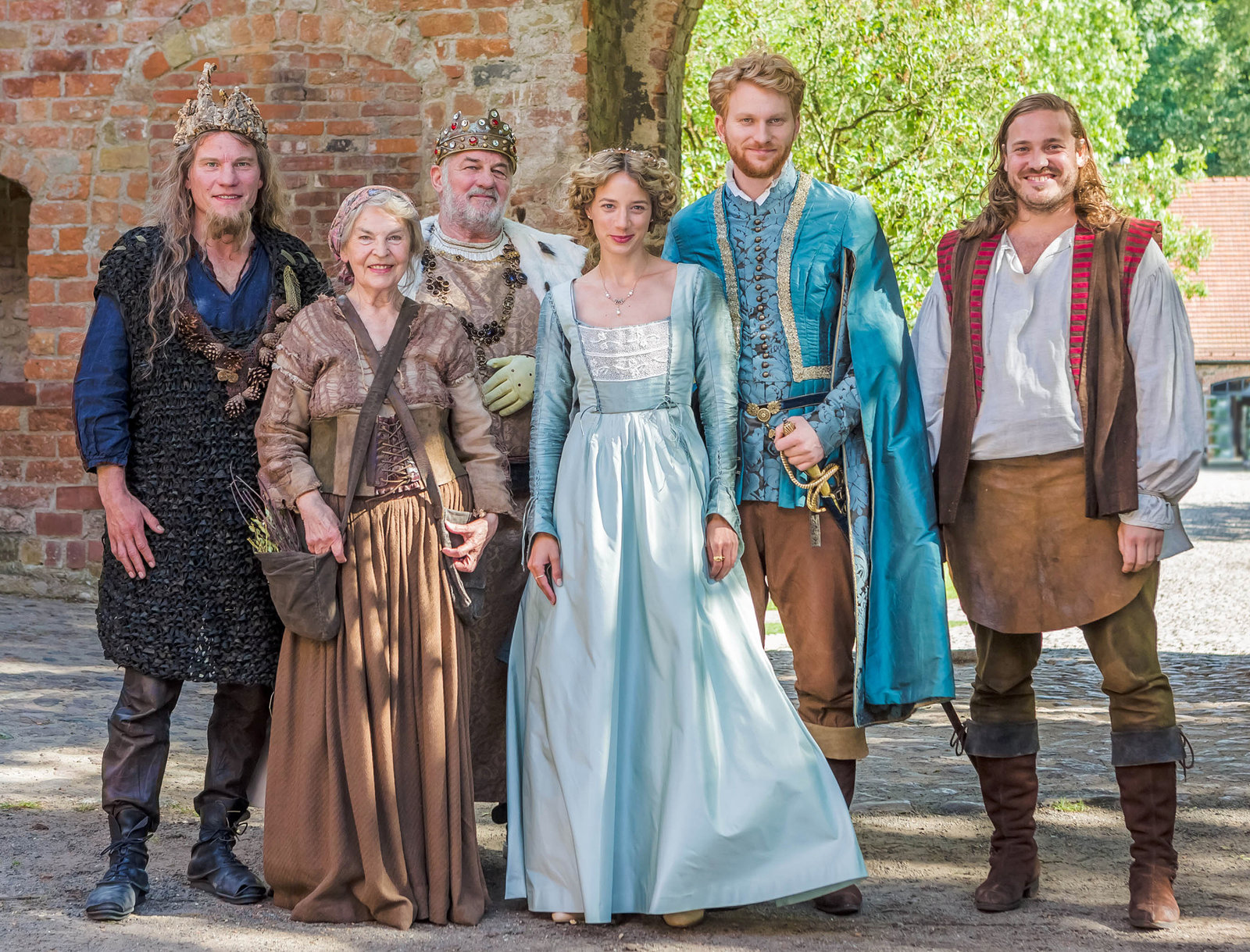 Die SalzprinzessinDas Brautpaar tritt vor das Schloss. Amélie (Leonie Brill) ist Königin, König Cristof (Leonard Lansink, mi.) übergibt seine Tochter an seinen Schwiegersohn Prinz Thabo (Elvis Clausen).Bild: © WDR/Kai Schulz