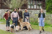 Die drei KönigskinderBei der Geburt wurden die drei Königskinder durch Hunde ersetzt – hier treffen sie zusammen mit ihren „Hundegeschwistern“ auf die Pflegeeltern Emmi (Sonsee Neu) und Hans (Adam Bousdoukos). (v.l.n.r. Fritz (Caspar Kryzsch), Hans (Adam Bousdoukos), Theo (Maximilian Ehrenreich), Emmi (Sonsee Neu) und Lotte (Hedda Erlebach) mit den drei Hunden von König Alexander)Bild: © SWR/Patricia Neligan