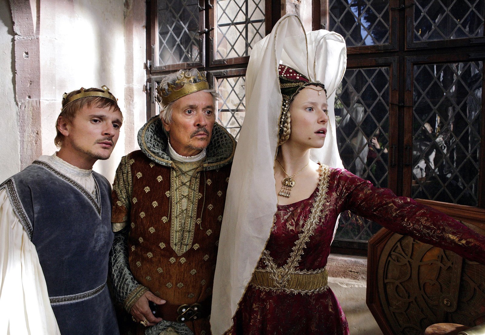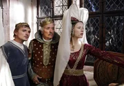 Die GänsemagdKönig Gustav (Henry Hübchen, Mitte), Prinz Leopold (Florian Lukas) und Elisabeths Zofe Magdalena (Susanne Bormann), die sich als Prinzessin Elisabeth ausgibt, bemerken im Hof einen Tumult.Bild: © HR/Kinderfilm GmbH/Felix Holland
