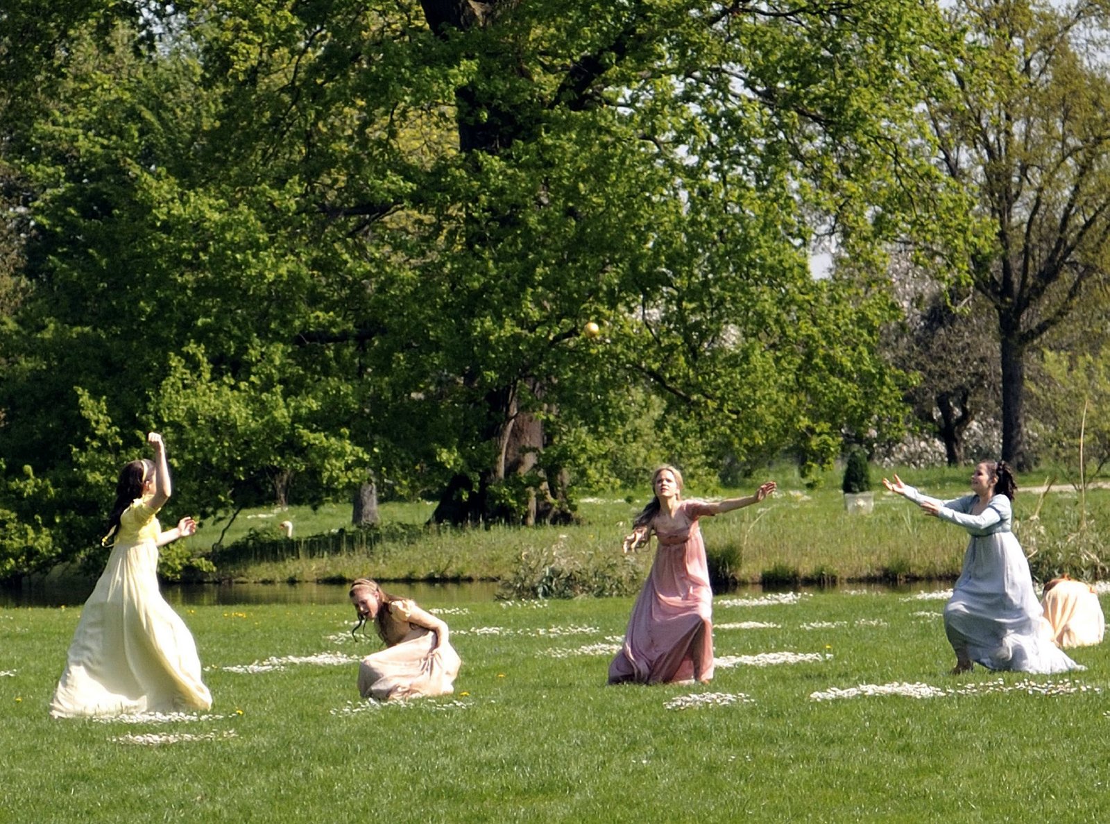 Der FroschkönigDie Prinzessinnen spielen mit dem schönsten Geburtstagsgeschenk von Königstochter Sophie: Einer goldenen Kugel, die Sophie helfen soll, der Stimme ihres Herzens zu folgen (von links: Johanna Leinen, Joana Mendl-Fink, Sidonie von Krosigk, Marie-Luise Stahl).Bild: © SWR/SWR/Markus Bitterwolf
