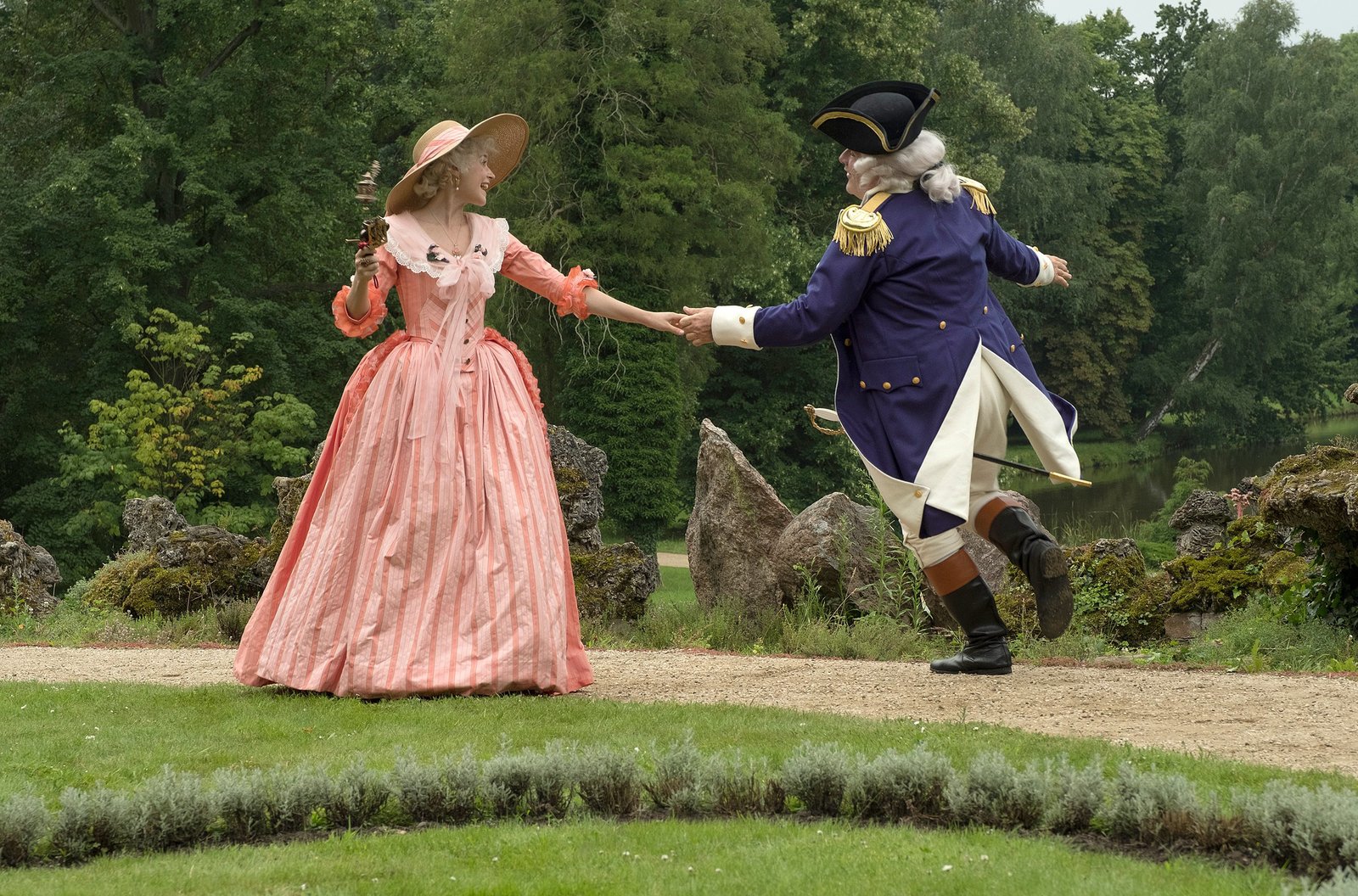 Der SchweinehirtPrinzessin Victoria von Siebenlande (Jeanne Goursaud) und ihr Vater, der Kaiser von Siebenlande (Bernhard Schütz), tanzen ausgelassen und fröhlich dank der Melodie der wunderlichen Ratsche.Bild: © rbb/Michael Rahn