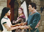 Prinzessin MaleenMaleen (Cleo von Adelsheim) und Konrad (Peter Foyse) kurz vor der vermeintlichen Vermählung. Walpurgas Zofe Uta (Paula Paul, Mitte) wacht darüber, dass Maleen auch ja in ihrem Sinne handelt.Bild: © BR/Hubert MICAN Fotoproduktion