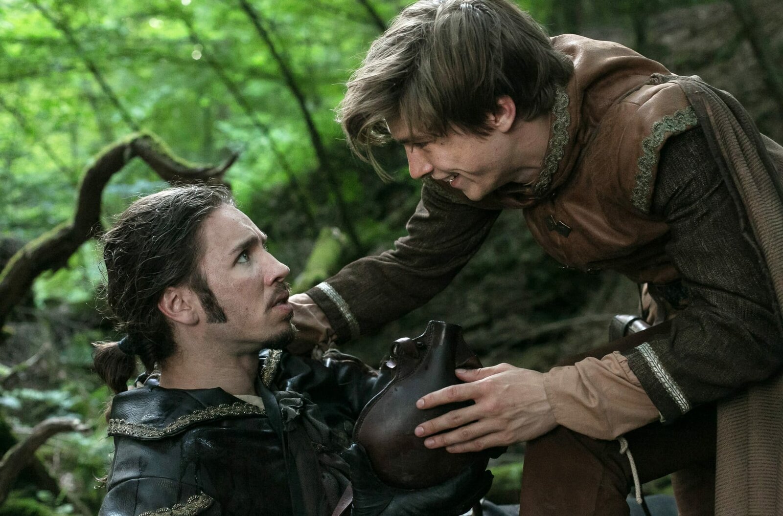 Das Wasser des LebensPrinz Lennard (Gustav Schmidt, r) gibt dem verletzten Bruder Prinz Falk (Gil Ofarim) vom Wasser des Lebens zu trinken.Bild: © MDR/WDR/Kai Schulz