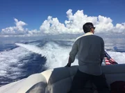 Atlantis - Hochkultur in NordamerikaRob Nelson looks out at the skyline of Miami as he rides on a boat towards the island of Bimini, the closest Bahamian island to the United States.Bild: © Discovery Communications Lizenzbild frei