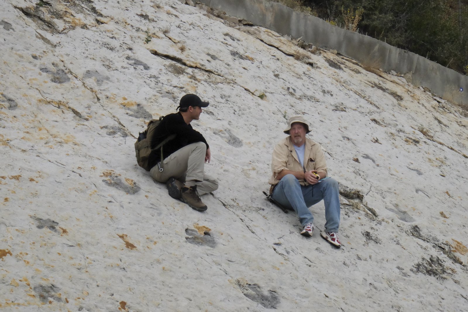 Spuren des LebensRob Nelson and paleontologist Martin Lockley surrounded by fossilized dino footprints at Dinosaur Ridge in Colorado.Bild: © Discovery Communications / Brittany Agnew Lizenzbild frei