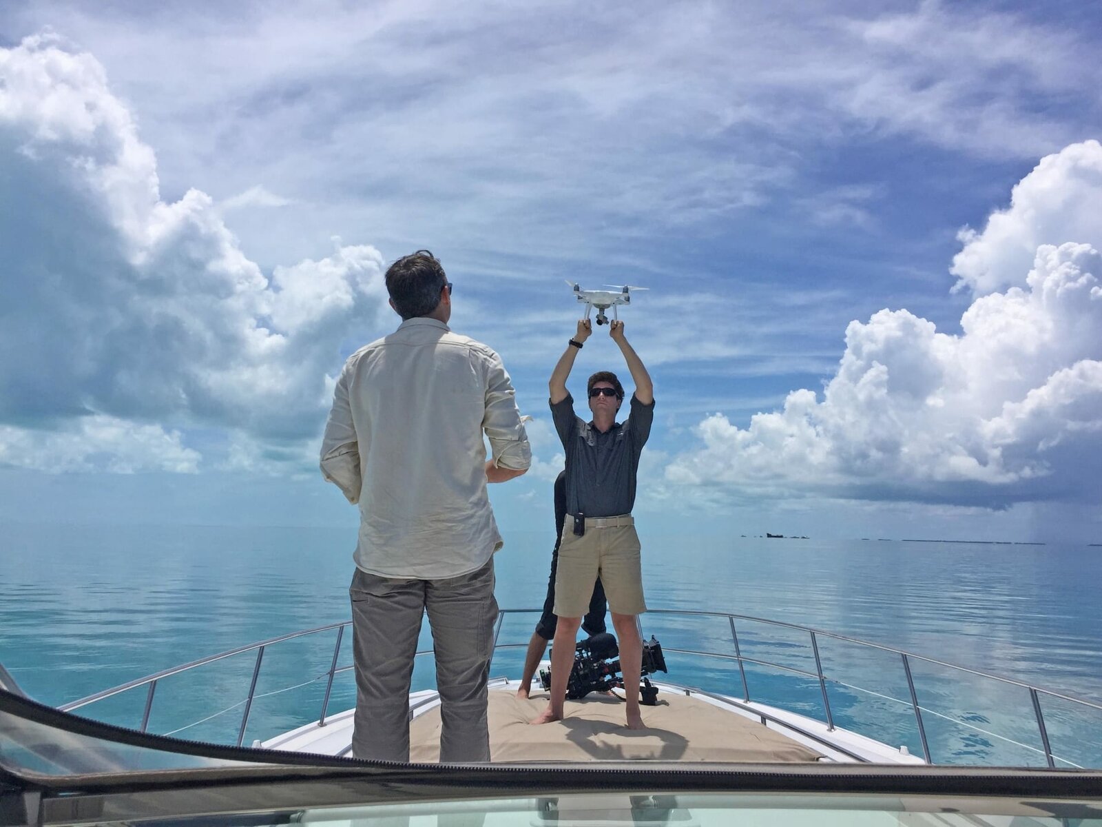 Atlantis - Hochkultur in NordamerikaBehind the scenes photo as Rob and Stefan launch a drone from the back of their boat off the coast of Bimini.Bild: © PLURIMEDIA (Discovery Communications)