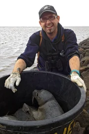 Expedition ins WattRettung im Watt, Jan Dohndorf hat zwei gestrandete Heuler eingefangen.Bild: © BR/Radio Bremen / Volkmar Strueßmann