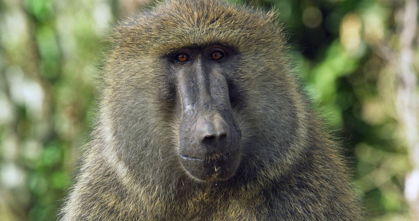 Pavian-Männchen Rakiki schaut dem Kameramann direkt in die Linse.Bild: © RTS