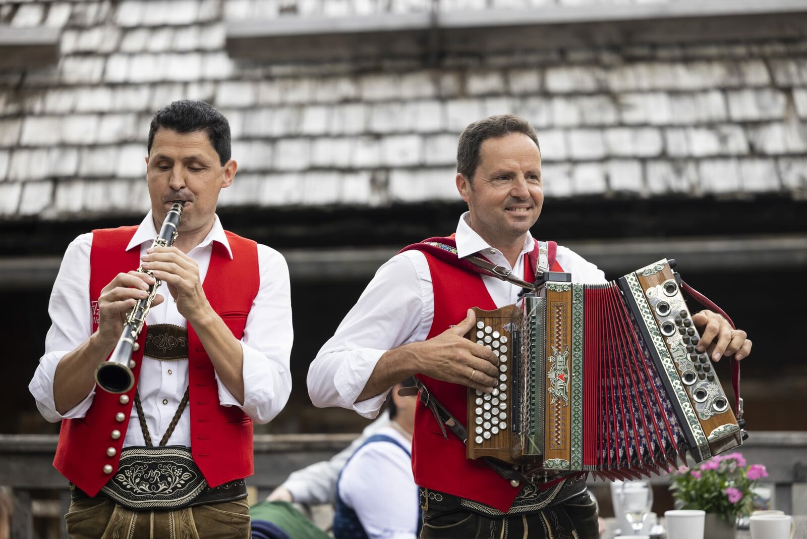 In FilzmoosL-R: Conny Bürgler und Richard Deutinger beim Musikantenstammtisch in FilzmoosBild: © ServusTV / Manuel Seeger