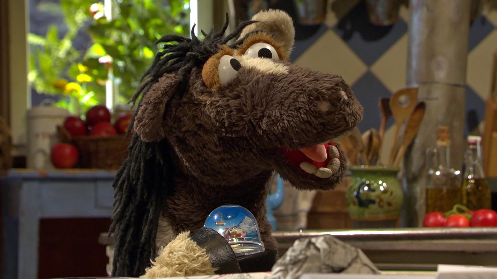 TauschrauschPferd hat eine tolle Schneekugel von tante Hüfli bekommen.Bild: © NDR/Sesame Workshop