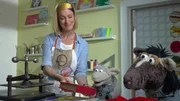 Ganz schön schwer!Wolle und Pferd wollen einen Apfelkuchen backen. Dumm nur, dass es gerade jetzt ihre Lieblings-Äpfel nicht zu kaufen gibt. Aber jetzt im Sommer gibt es noch etwas viel Besseres...Bild: © NDR/Uwe Ernst