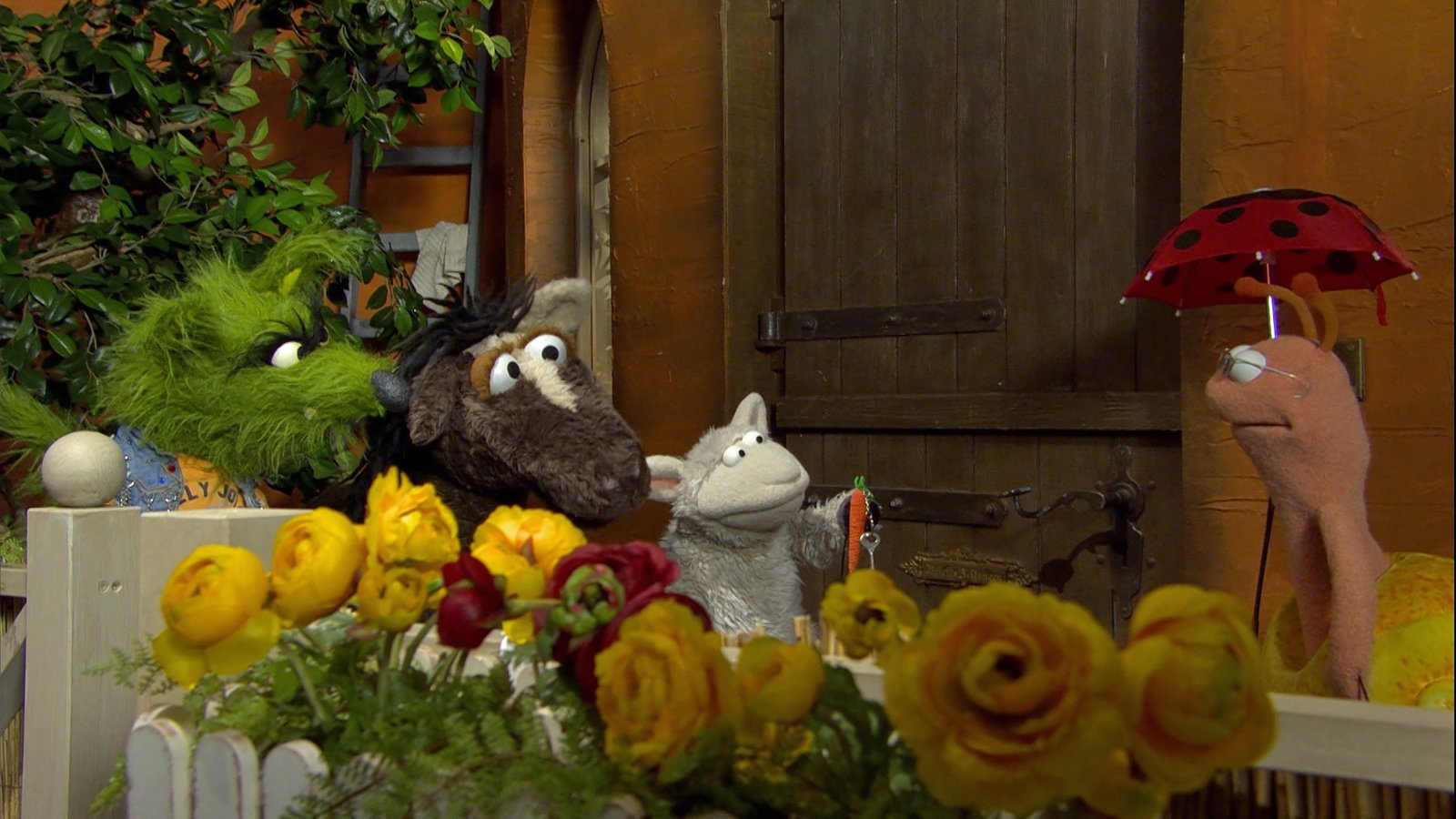 Ausgesperrt!Finchen erinnert Wolle und Pferd an den Ersatzschlüssel unter der Fußmatte.Bild: © NDR/Sesame Workshop