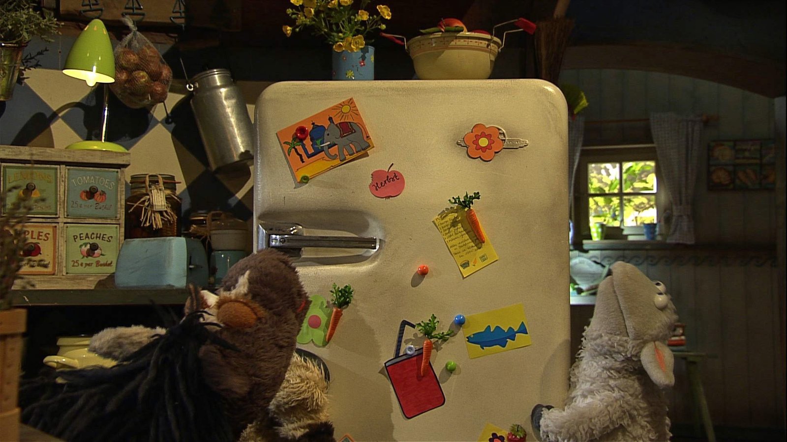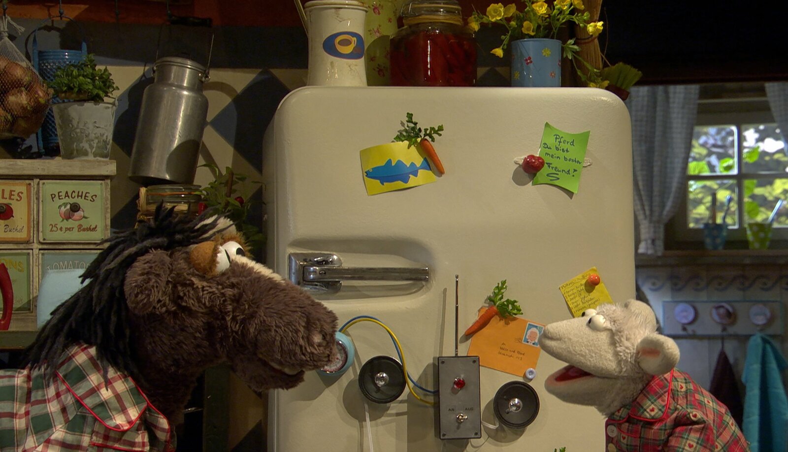 Echte HeldenWolle und Pferd hätten so gerne ihren Kühlschrank oben auf der Dachterrasse, um dort kühle Getränke genießen zu können. Doch alleine bekommen sie das Ding einfach nicht nach oben.Bild: © NDR/Sesame Workshop