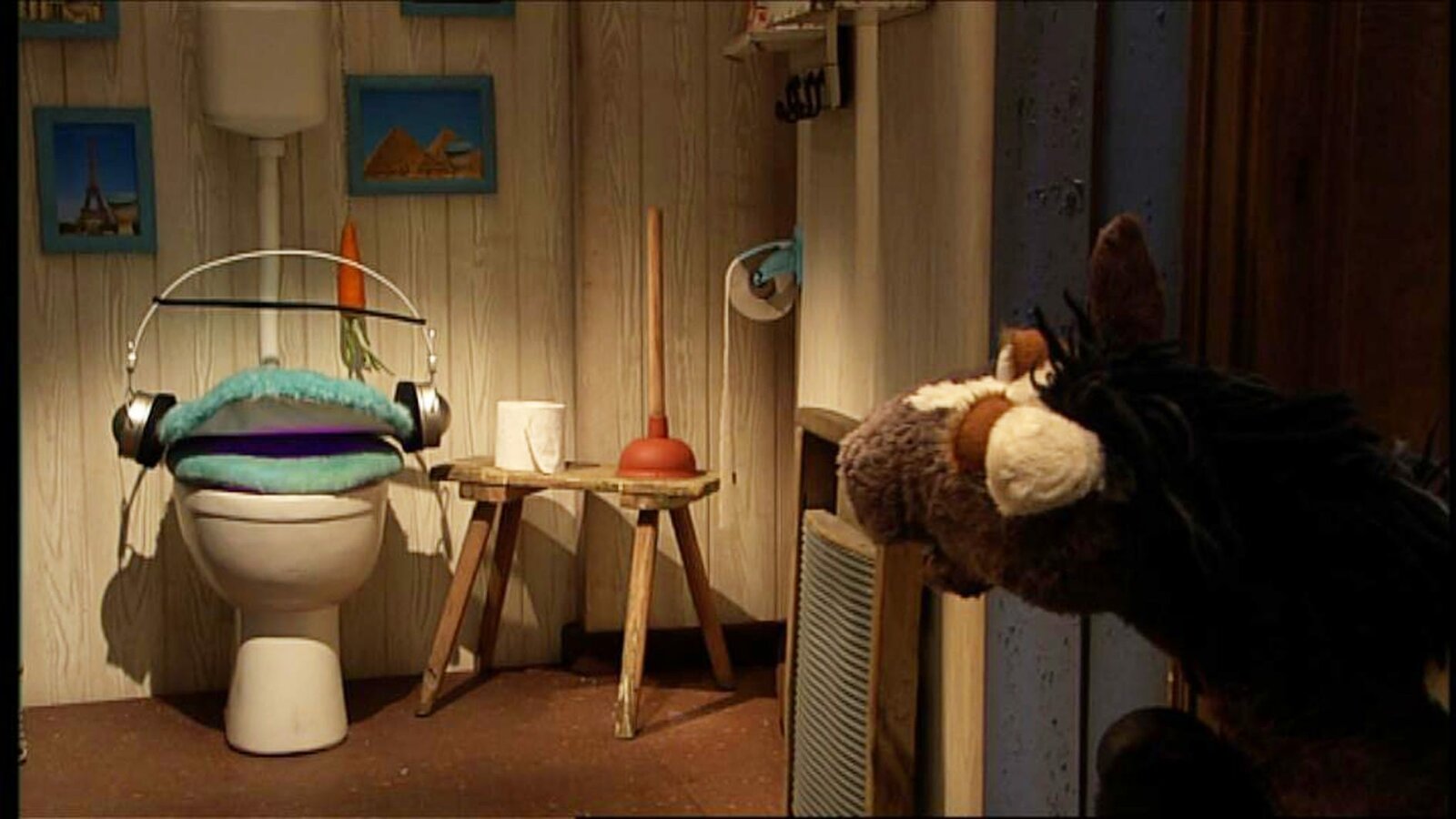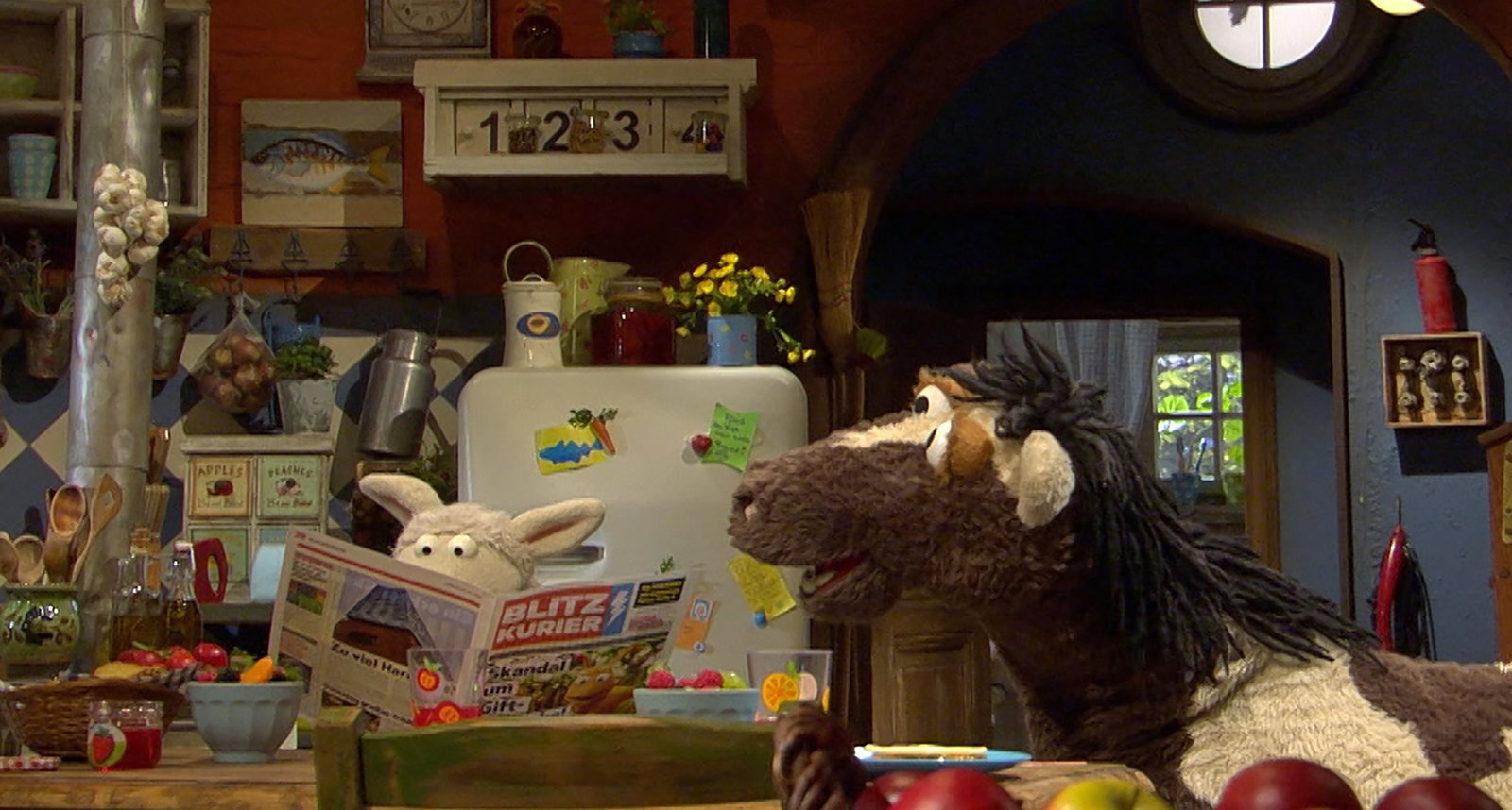Blöder, schöner HerbstPferd sollte auf die frisch gemachte Marmelade aufpassen. Aus Versehen fallen ihm alle Gläser von der Fensterbank und gehen kaputt. Pferd will sein Missgeschick nicht zugeben und erzählt Wolle in seiner Not eine Lüge.Bild: © NDR/Sesame Workshop