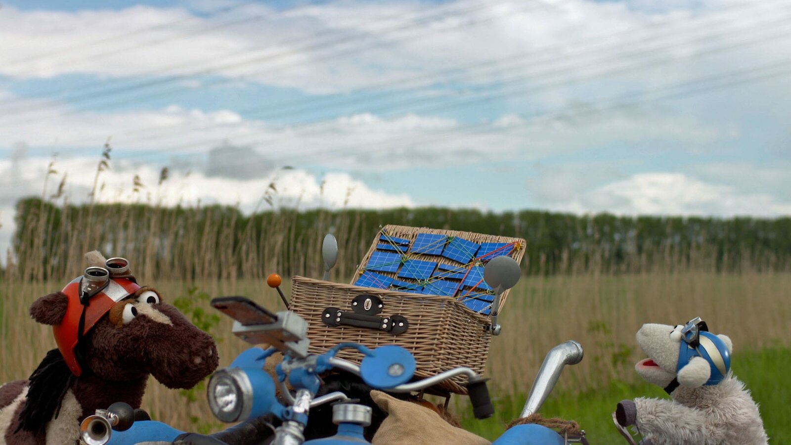Die PanneWolle hat das Möhrtorrad zu einem Solar-Mobil umgebaut.Bild: © NDR/Sesame workshop