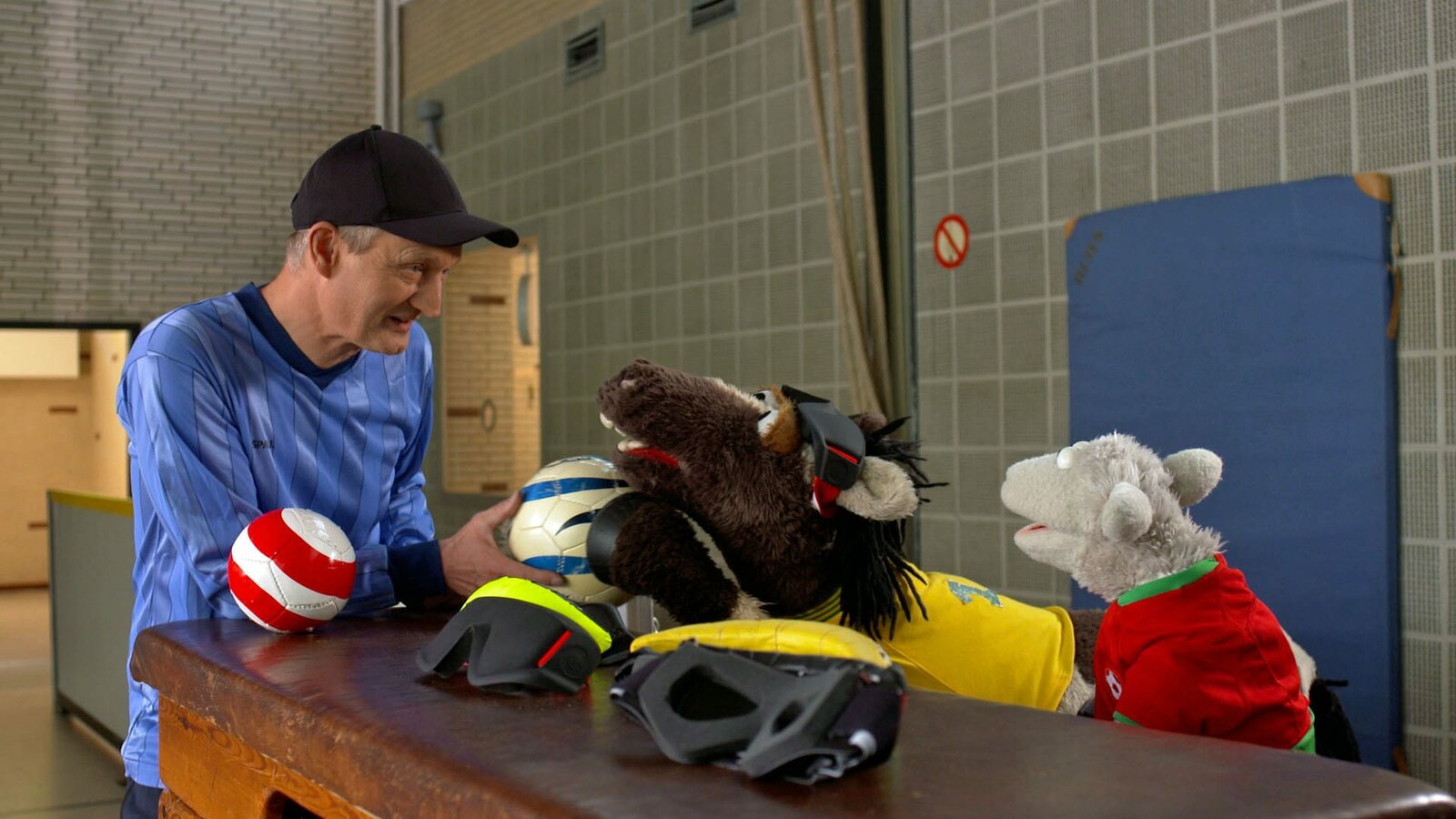 BlindenfußballDer Trainer erklärt Wolle und Pferd, wie man Blindenfußball spielt.Bild: © NDR/Sesame workshop