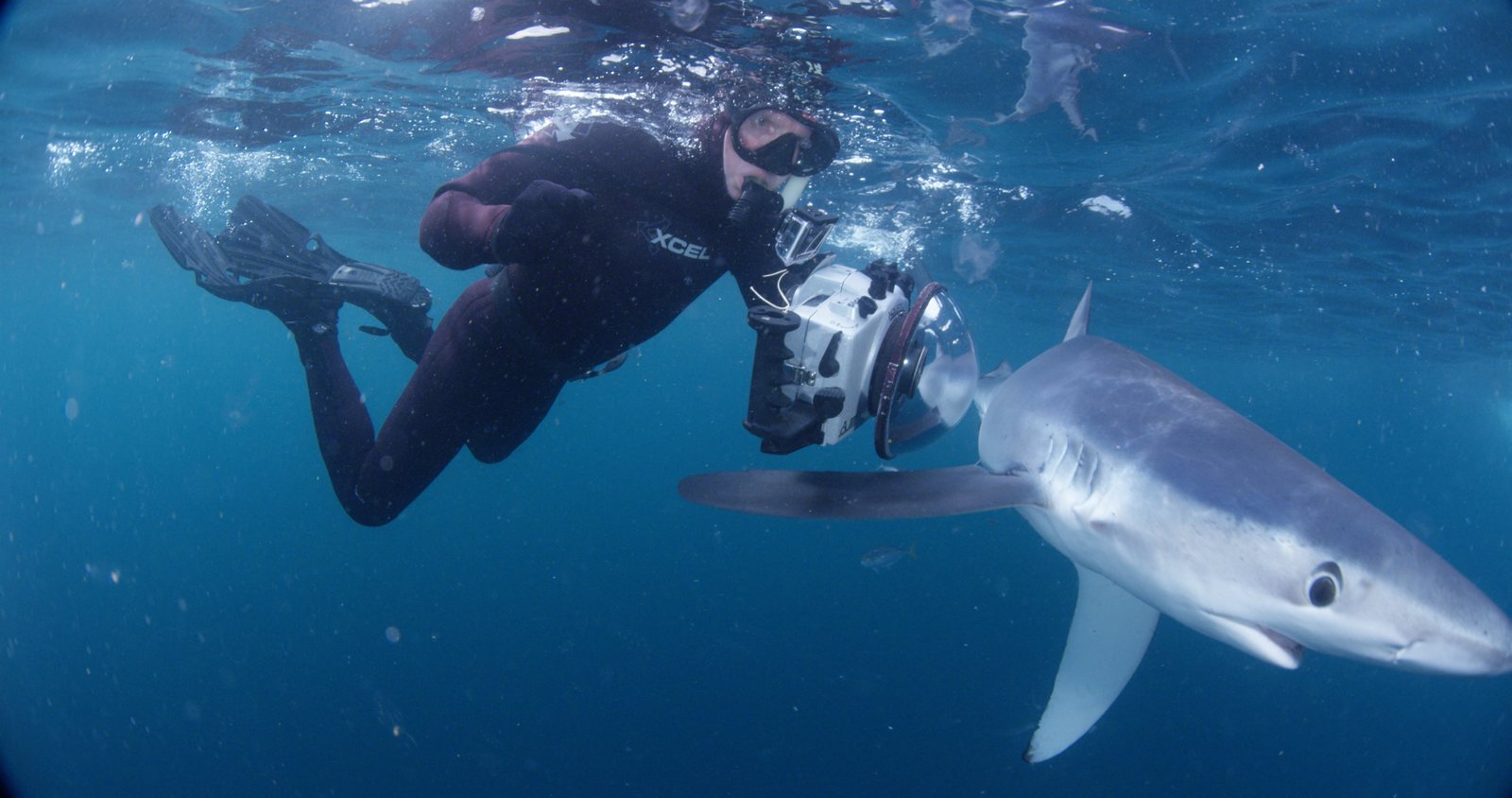 Shark Vortex - Konferenz der HaieDr. Greg Skomal underwater holding a camera with blue shark.Bild: © Discovery Channel / Discovery Communications