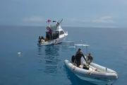 Shaquille O'Neal: Hai-Way to HellWide shot of crew boats in the ocean.Bild: © Discovery Communications