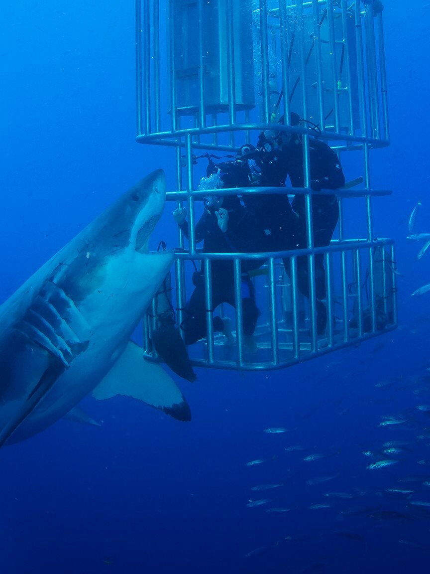 Great White Abyss - Die Weißen Haie von GuadalupeJimi in cage looking at the shark.Bild: © 2021 DISCOVERY DEUTSCHLAND