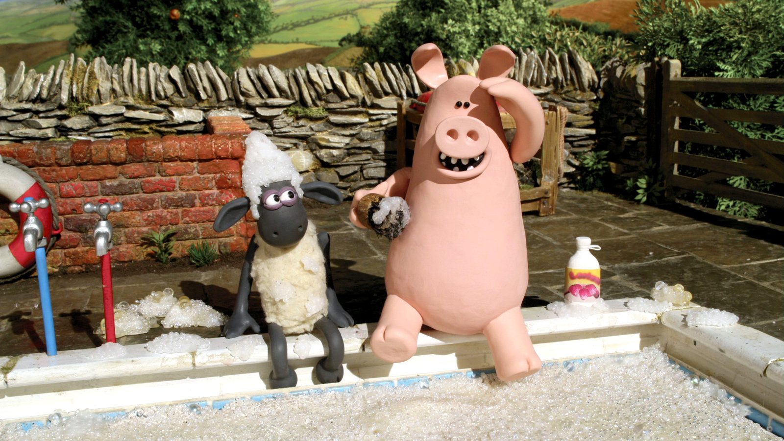 In der WaschstraßeBitzer hält die Luft an: Der Bauer muss sich dringend waschen!Bild: © WDR/Aardman Animation Ltd./BBC