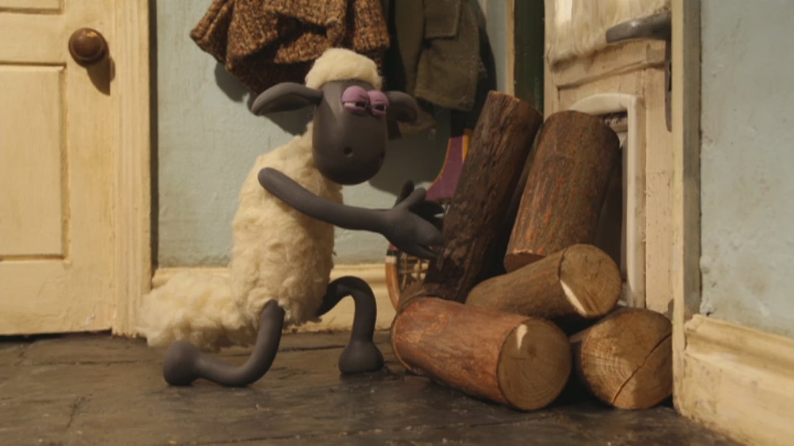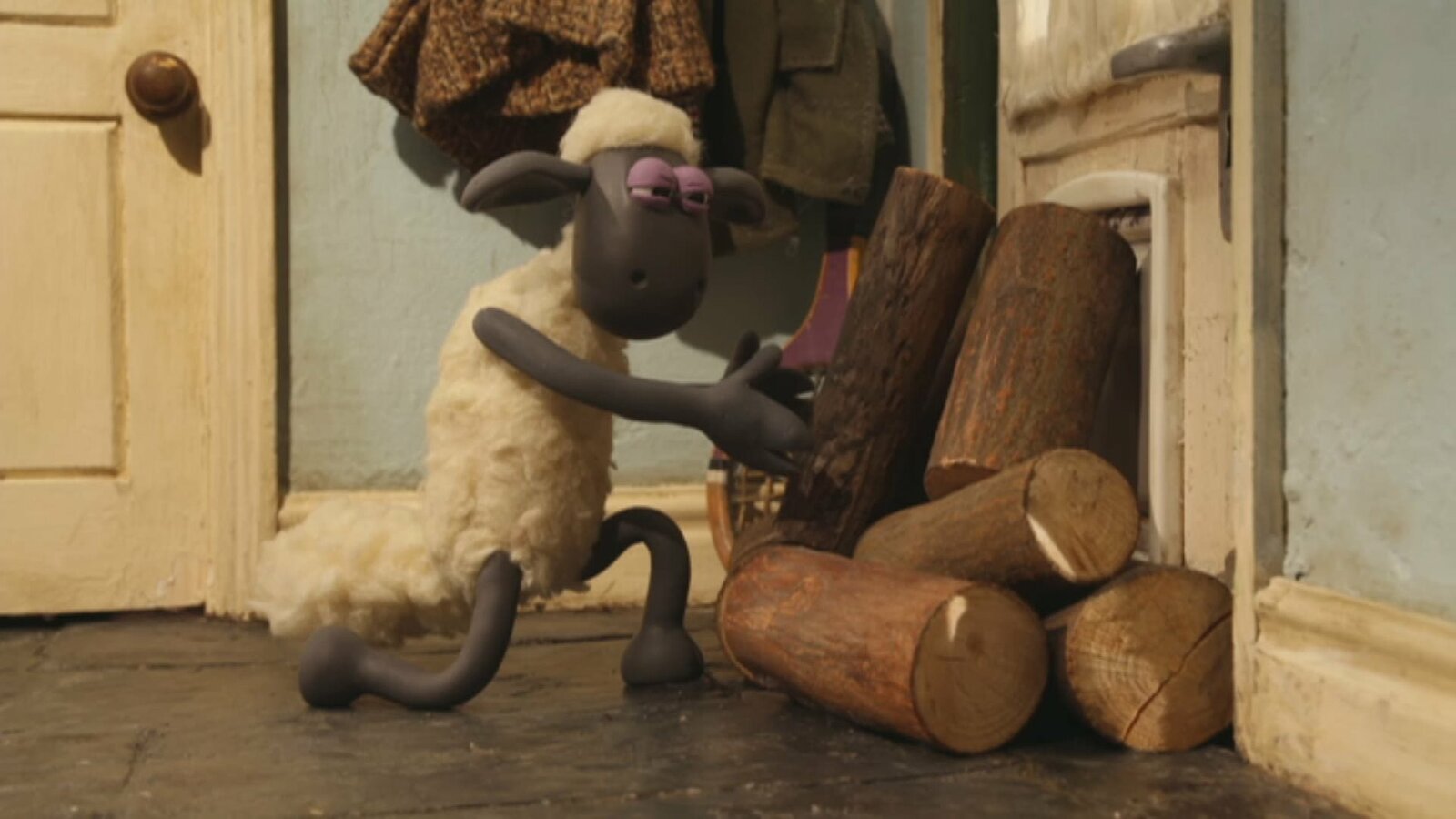 Das WindradShaun möchten Bitzer helfen, sein warmes Plätzchen vor dem Kamin zu behalten.Bild: © KiKA