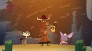 Wer hat den Papagei zum Niesen gebracht?Die Fledermaus bittet Sherlock Yack und Hermione um Hilfe: Alle Saiten ihrer Gitarre sind gerissen.Bild: © ZDF/Mondo tv