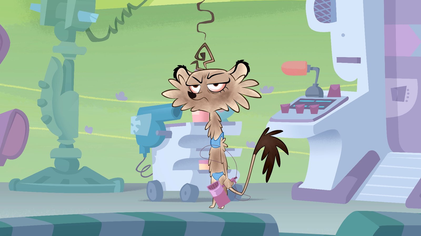 Wer wollte Frau Fuchsberger ausschalten?Sherlock Yack zeigt Frau Fuchsberger die Ursache für den Kurzschluss, bei dem Hermione zerzaust wurde.Bild: © ZDF/Mondo tv
