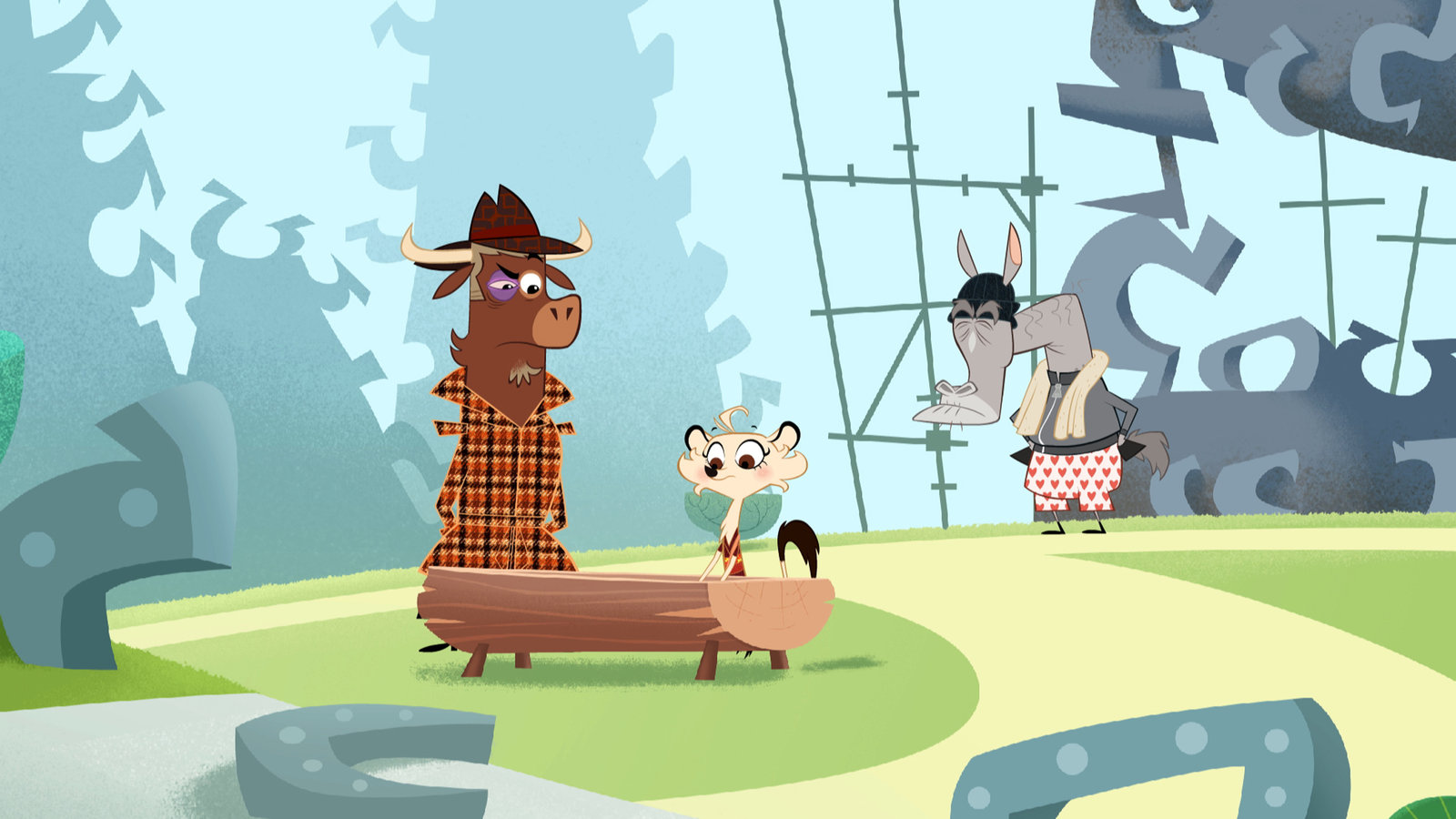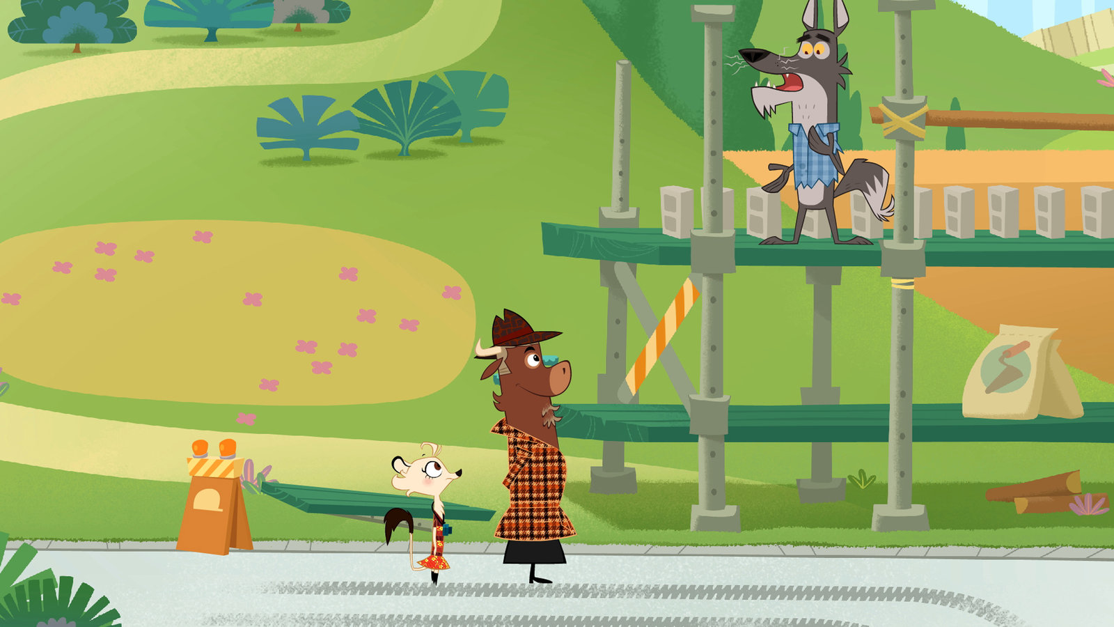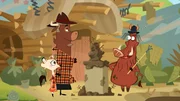 Wer hat beim Stinktier rumgekleckert?Der Kojote beschreibt Sherlock Yack und Hermione den Tathergang.Bild: © ZDF/Mondo TV