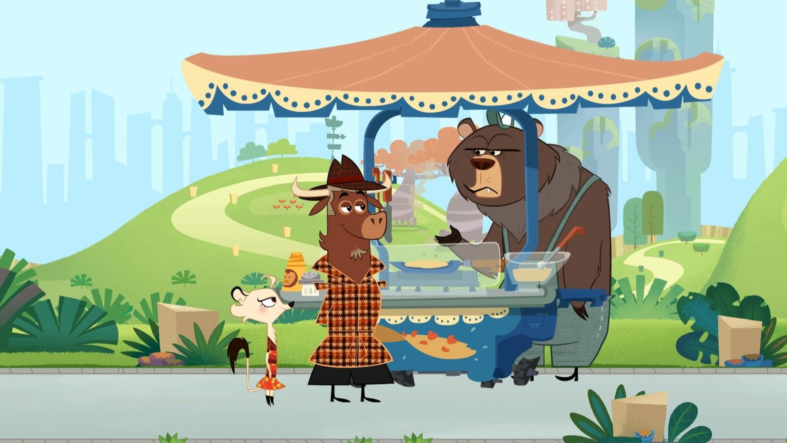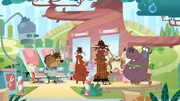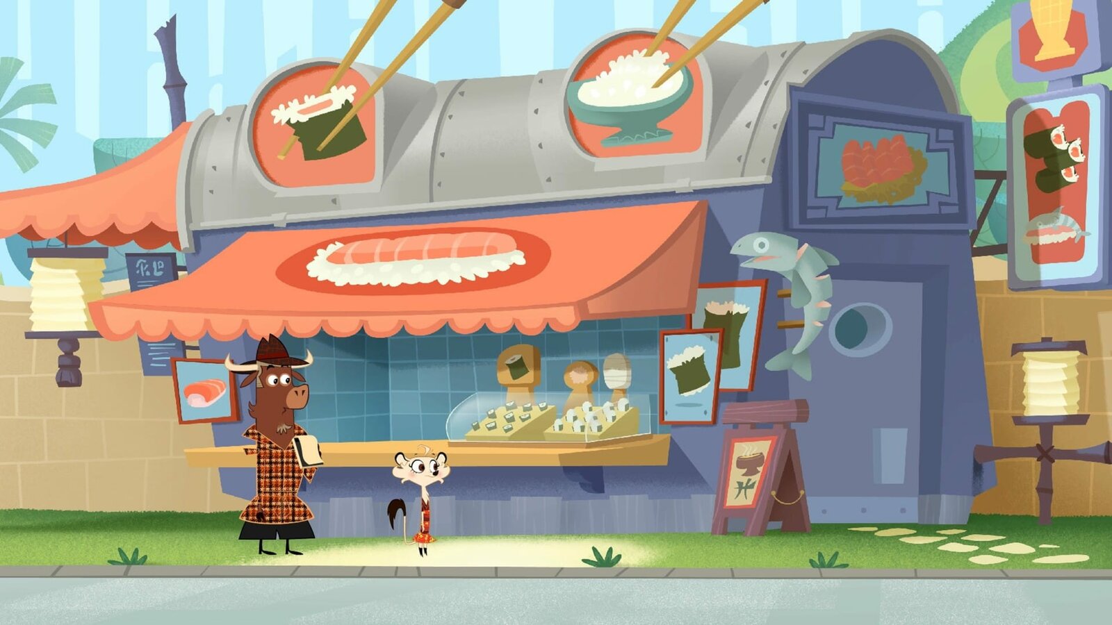 Wer hat die Schildkröte ausgebremst?Sherlock Yack und Hermione am Sushi-Stand des Waschbären.Bild: © ZDF/Mondo tv
