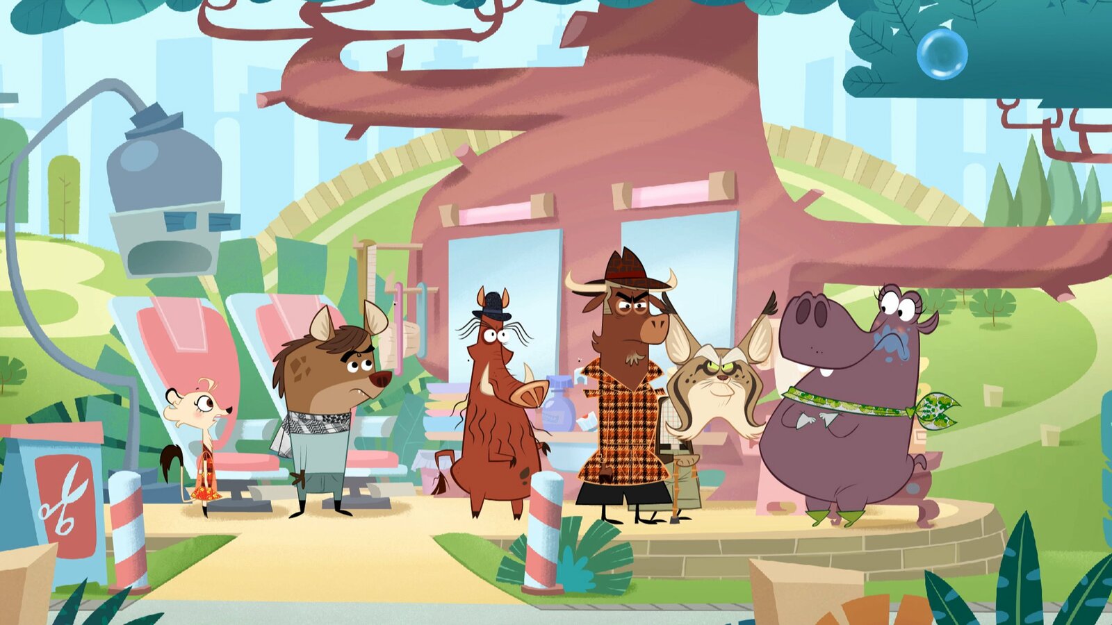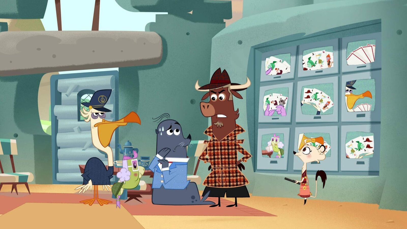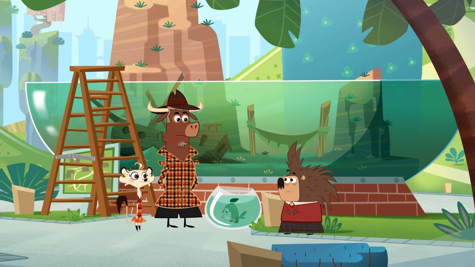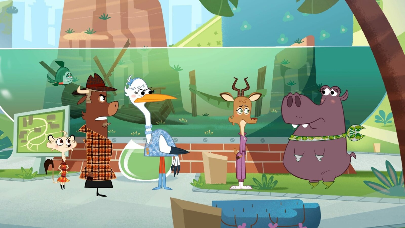 Wer hat das Meerschweinchen aus der Bahn geworfen?Sherlockk Yack und Hermione haben die drei Verdächtigen vor dem Piranha-Becken versammelt: Fräulein Storch, die Gazelle und Frau Hipplinger.Bild: © ZDF/Mondo TV
