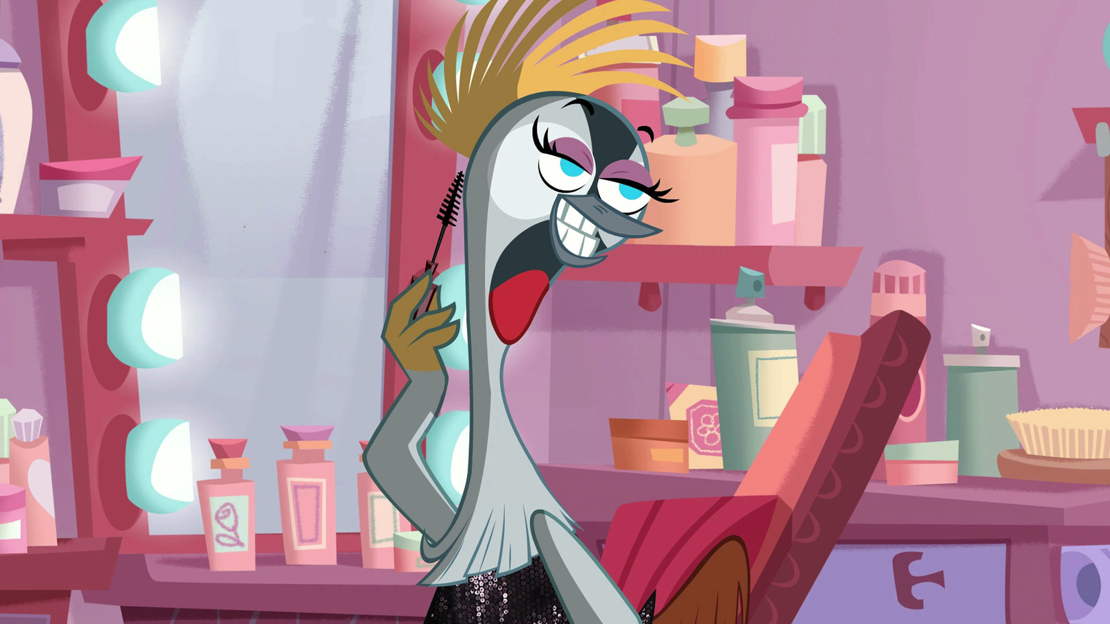 Wer hat Fräulein Strauss gelackmeiert?Fräulein Kranich kann sich nicht vorstellen, wer ihrer Konkurrentin das grüne Haarspray untergejubelt hat.Bild: © ZDF/Mondo tv