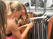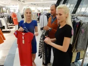 Motto in Hamburg: Mädelsabend deluxe - Style dich für einen heißen Abend mit den SixxPaxx!, Tag 3: RenateV.l.: Shoppingbegleitung Britta, Kandidatin Renate und VerkäuferinBild: © TVNOW / Constantin Ent.