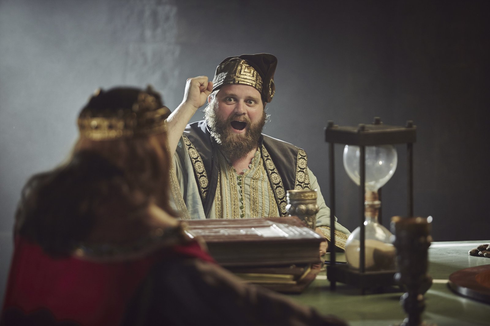 Folge 6Lancelot (Holger Stockhaus) erzählt der Tafelrunde von einer weiteren Heldentat.Bild: © ZDF und Kristof Galgoczi Nemeth