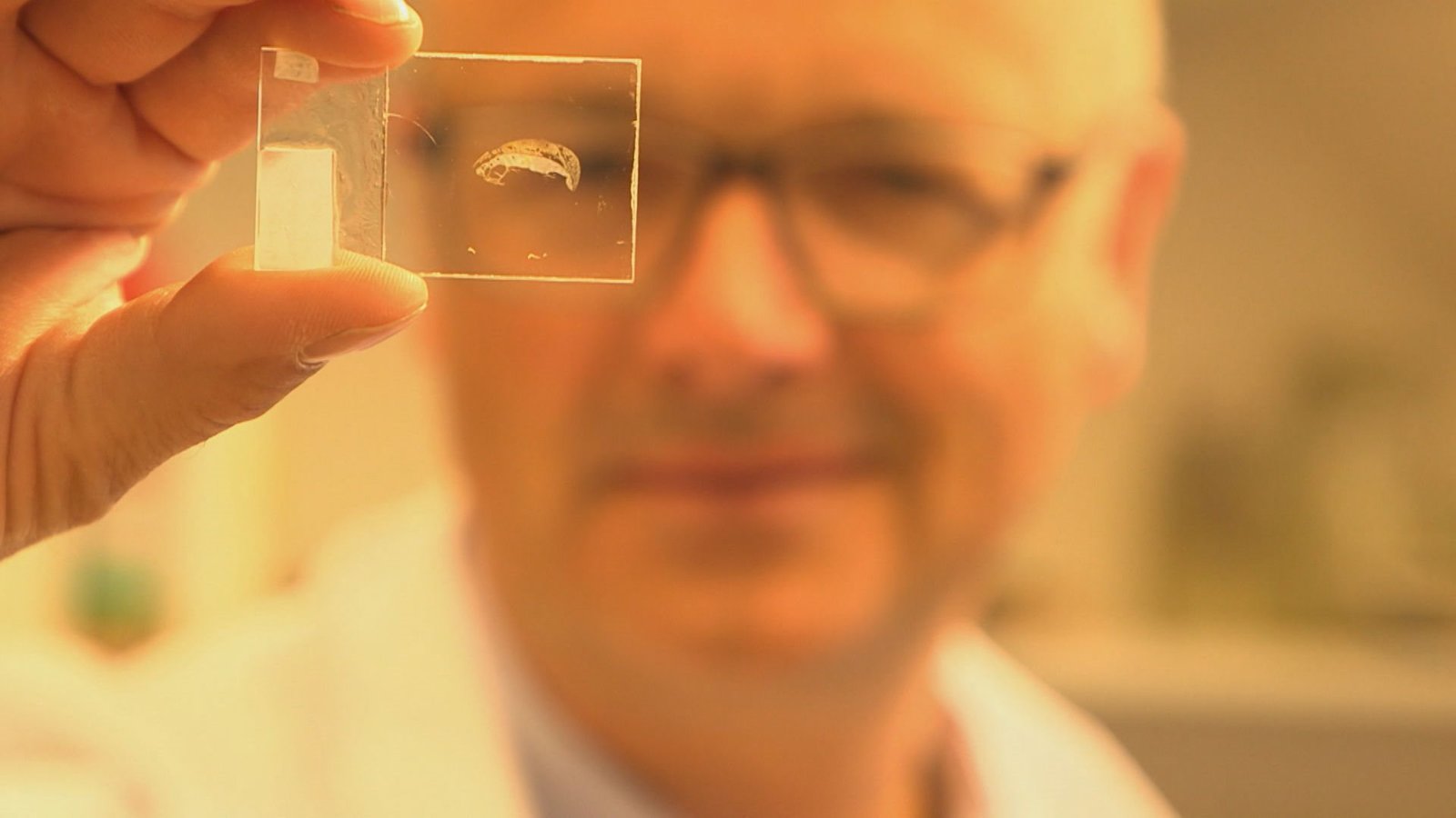 Wenn Knochen erzählenKarsten Schwanke mit dem Dünnschliff einer Rippe. Der Dünnschliff ist nur ein Fünfzigtausendstel Millimeter dünn.Bild: © BR/Maximilian Schecker / Maximilian Schecker