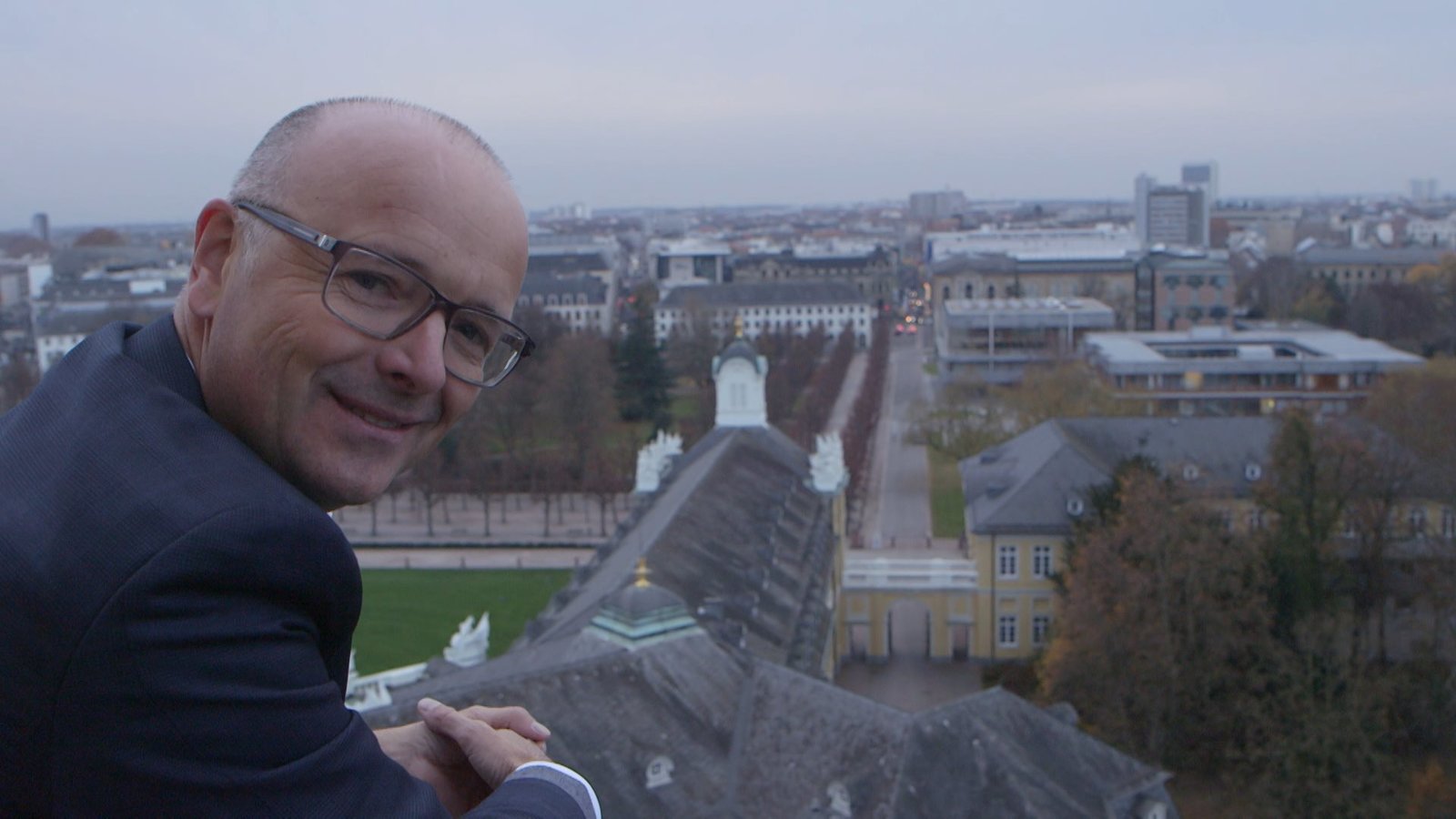 Das große Politik-EinmaleinsWissenschaftsmoderator Karsten Schwanke auf dem Schlossturm in Karlsruhe.Bild: © BR/Maximilian Schecker